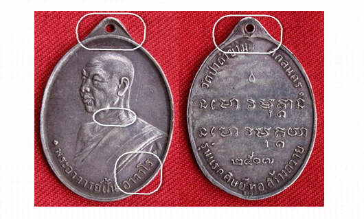 มาเทียบให้น่ะค่ะ ทุกอย่างเหมือนกันเลย ยกเว้นเนื้อเหรียญค่ะ เหรียญนี้เก๊ ก็แปลว่าของอาจารย์ท่านก็เก๊