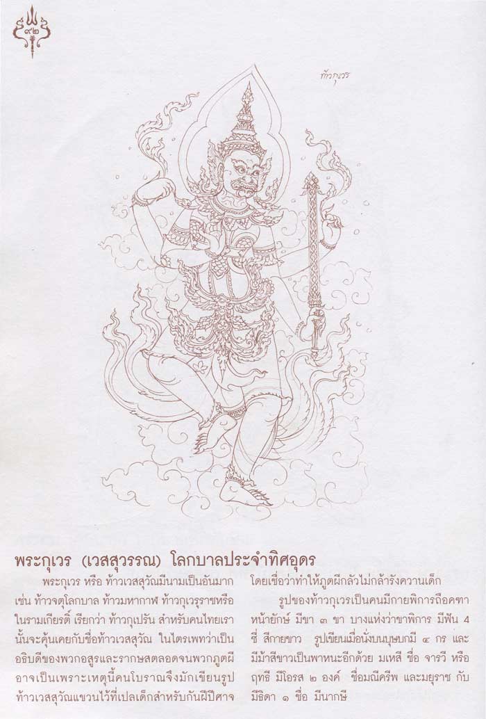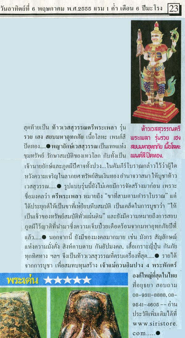 ทั้งนี้ ผมขอนำข้อความที่ "สีกาอ่าง" จากคอลัมน์ "สนามพระ" ลงในไทยรัฐฉบับวันอาทิตย์ที่ 6 พฤษภาคม 2555 มาลงอีกครั้งเพื่อให้เพื่อนสมาชิกเว็บจีได้อ่านกันชัดๆ ดังนี้ครับ "ท้าวเวสสุวรรณตรีพระเพลา รุ่น รวย เฮง สยบมหาอุทกภัย เนื้อโลหะ เพ้นสีปิดทอง พญายักษ์เวสสุวรรณเป็นเทพแห่งขุมทรัพย์ รักษาสมบัติของเทวโลก กับทั้งเป็นเจ้านายของยักษ์และภูติผีปีศาจทั้งปวง ในคัมภีร์โบราณกล่าวไว้ว่าผู้ใดหวังความเจริญในลาภยศทรัพย์สินเงินทองอำนาจวาสนาให้บูชาท้าวเวสสุวรรณ รูปแบบรุ่นนี้ยังไม่เคยมีการจัดสร้างมาก่อน เพราะชื่อมงคลว่าตรีพระเพลา หมายถึงขาที่สามตามตำราโบราณแต่ประยุกต์ให้เป็นขาเหยียบหีบสมบัติ เป็นเคลดในการบูชาว่าเป็นเจ้าของทรัพย์สมบัติทั่วแผ่นดินและยังมีความหมายในการสยบภูติผีไร้ญาติที่นำมาซึ่งความเจ็บป่วยเดือดร้อนจากมหาอุทกภัยปีที่แล้ว นอกจากนี้ยังมีของมงคลมากมาย เช่นมังกร สัญลักษณ์แห่งความมั่งคั่ง สิงห์คาบดาบกันอัปมงคล เสื้อเกราะญี่ปุ่นกันภัยทุกทิศทาง จึงเป็นท้าวเวสสุวรรณที่ครบเครื่องที่สุด รายได้จากการบูชาเพื่อสมทบทุนสร้าง เจ้าแม่กวนอิมปาง4พระพักตร์องค์ใหญ่ที่สุดในประเทศไทย"