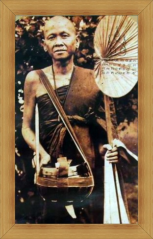 ด้านหลังเท่าที่ผมมองเห็น น่าจะเป็นพระนุ่งจีวร มือขวาถือของมีด้วมยาวๆ มือซ้ายถือตาลปัตร สะพายย่ามหรือป่าวผมไม่ค่อยแน่ใจ แต่เป็นรูปที่เกิดจากการขีดหรือเขียนลงไปครับ