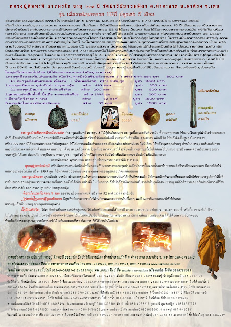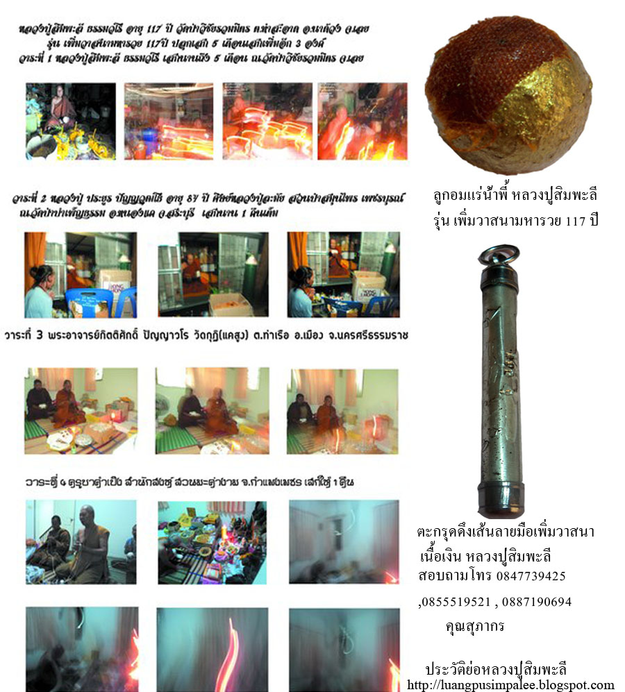 กับหลวงปู่สิมพะลี ที่หมู่บ้านภัสสร 3บ้านเลขที่ 35/397 ซ.8/2 รังสิตคลอง3 ตรงข้ามบิ๊กซีคลอง3 อ.คลองหลวง จ.ปทุมธานี โทร 084-7739425, 085-5519521, 088-7190694 โอนเงินทางธนาคาร เลขที่บัญชี 025-0-06551-3 ธนาคารกรุงเทพ ,ออมทรัพย์ ชื่อ supakorn wongkham (ไม่หักค่าใช้จ่ายใดๆทั้งสิ้น)โอนเงินมาเพื่อจองคิวและเมื่อวันงานจะถอนออก มาใส่พานครูเพื่อถวายหลวงปู่โดยท่านเองคนที่โอนจะได้เข้าก่อน