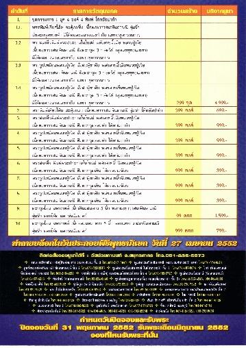 วัตถุมงคลรุ่นนี้ มีพิมพ์ที่จัดสร้าง อาทิ 1.พิมพ์เศียรโล้นสะดุ้งกลับ จุ่มรัก 2.พิมพ์พระประธานในโบสถ์ หลังลายนิ้วมือหลวงปู่เจือ 3.พิมพ์รูปเหมือนหลวงปู่เจือ นั่งสะดุ้งกลับ หลังลายนิ้วมือหลวงปู่เจือ 4.พิมพ์รูปเหมือนหลวงปู่เจือ นั่งสะดุ้งกลับ หลังลายเซ็นหลวงปู่เจือ 5.ตะกรุดโทนพอกยาจินดามณี จุ่มรัก