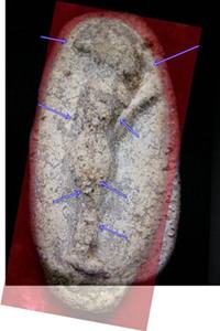 การพิจารณาผิวของ "พระวัดพลับ" ที่บรรจุอยู่ในกรุเจดีย์กระรอกเผือกเป็นเวลานานนับร้อยกว่าปีนั้น ให้ดูที่สีผิวขององค์พระจะค่อนข้างขาว ปรากฏเป็นคราบน้ำ ตกผลึกเป็นสีขาวและสีเหลืองอ่อนเจือปนที่เรียกกันว่า 'ฟองเต้าหู้' สันนิษฐานว่า เกิดจากคราบน้ำในกรุหรือคราบน้ำฝนที่รั่วไหลเข้าไปในกรุ ทำปฏิกิริยากับเนื้อพระที่มีส่วนผสมของปูนขาว เมื่อกาลเวลาผ่านไปจึงเกิดเป็นหินปูน พระบางองค์ดูเหมือนมีเนื้องอกขึ้นจากพื้นผิวขององค์พระเป็นเม็ดๆ อันเกิดจากสภาพของกรุพระเจดีย์ ซึ่งตอนกลางวันได้รับความร้อน พระในกรุก็จะอมความร้อนไว้ เมื่อกระทบกับน้ำที่ซึมเข้ามาในกรุผสมกับปูนขาว จึงกลายเป็นปูนเดือดบนองค์พระและตกตะกอนเป็นเม็ดๆ คล้ายเนื้องอก แต่จะเป็นที่พื้นผิวเท่านั้นไม่ได้เกิดจากเนื้อขององค์พระ เมื่อขูดเอาเนื้องอกส่วนนั้นออก ผิวขององค์พระก็จะเรียบเหมือนเดิมทุกประการ