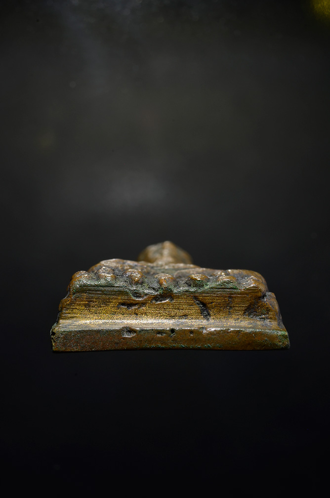 ตรงรอยตะไบใต้ฐาน จะเห็นเป็นสีทองๆนั่นไม่ใช่กะไหล่ นะครับ แต่เป็นพรายสีทอง ถ้าส่องจะเห็นเป็นเกร็ดๆเล็กๆผสมในเนื้อโลหะครับ