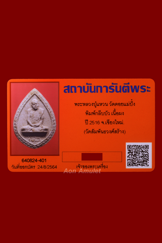 | พระผงรูปเหมือนนั่งในกลีบบัวตม หลวงปู่แหวน สุจิณฺโณ วัดดอยแม่ปั๋ง อ.พร้าว จ.เชียงใหม่ ปี พศ.2516 จัดสร้างโดย วัดสัมพันธวงศ์ กรุงเทพมหานคร วัตถุมงคลชุดนี้ของ หลวงปู่แหวน จัดสร้างด้วยกันหลายชนิดและเข้าพิธีปลุกเสกหลายวาระด้วยกัน ปูชนียวัตถุมงคลของหลวงปู่แหวน สุจินโณ วัดดอยแม่ปั๋ง จ.เชียงใหม่ ปี พศ.2516 พิธีปลุกเสกในวาระแรก ปี พศ.2516 -วัตถุมงคลชุดนี้มี พระพุทธรูปบูชาจำลอง ขนาด 5 นิ้ว 9 นิ้ว รวมพระเครื่องของหลวงปู่แหวน สุจินโณ ซึ่งได้อนุญาตให้ทางวัดเกาะจัดสร้างหลายชนิด เมื่อปี พศ.2516 -ปลุกเสกครั้งที่ 1 ในวันมาฆะบูชา 7 กุมภาพันธ์ พศ.2516 -ปลุกเสกครั้งที่ 2 เมื่อวันที่ 7 หลวงปู่อายุครบ 7 รอบ 16 มกราคม พศ.2517 พิธีมหาพุทธาภิเษกวาระที่ 2 หมายกำหนดการ ไว้ 3 วัน ประกอบพิธีมหาพุทธาภิเษก พระพุทธปฏิมาปรานประจำพระอุโบสถสร้างใหม่ ของวัดสัมพันธวงศ์ , พระพุทธรูปบูชาจำลองหน้าตัก 5 นิ้ว 9 นิ้ว และพิธีบรรจุพระบรมสารีริกธาตุ ที่พระเกศพระพุทธปฏิมาประธาน โดยกราบทูลอาราธนา เจ้าประคุณสมเด็จพระสังฆราชเสด็จเป็นประธานประกอบพิธี กับได้ทูลเชิญพลตรี พระเจ้าวรวงศ์เธอ พระองค์เจ้าภาณุพันธ์ ยุคล เป็นประธานอำนวยการจัดงาน และทูลเชิญ พลตรี พระเจ้าวรวงศ์เธอกรมหมื่นนราธิปพงษ์ประพันธ์ องค์อุปถัมภ์ของวัด เป็นประธานที่ปรึกษา ณ พระอุโบสถวัดสัมพันธวงศ์ ( วัดเกาะ ) กรุงเทพมหานคร วันที่ 29 , 30 , 31 ธันวาคม พศ.2517 กำหนดมหาพุทธาภิเษกเฉพาะวันที่ 30 ธันวาคม พศ.2517 -มีพิธีในวันจันทร์ที่ 30 ธันวาคม พศ.2517 สมเด็จพระสังฆราช ทรงประกอบ พิธีจุดเทียนชัยมหาพุทธาภิเษก เวลา 20.36 น. มีพระอาจารย์ผู้ทรงวิทยาคุณ จากภาคอีสาน ภาคเหนือ ภาคกลาง ภาคใต้ รวม 60 รูป มานั่งปรกบริกรรมภาวนาปลุกเสกตลอดคืน มีดังนี้ 1.หลวงปู่ขาว อนาลโย วัดถ้ำกลองเพล อุดรธานี ( ชรามาก จะแผ่พลังเมตตาจิตมาในวันพิธี ) 2.หลวงปู่แหวน สุจิณฺโณ วัดดอยแม่ปั๋ง เชียงใหม่ ( ชรามาก จะแผ่นพลังเมตตาจิตมาให้ในวันพิธี ) 3.พระอาจารย์บุญมา ฐิตเปโต วัดสิริสาลวัน อุดรธานี 4.พระอาจารย์อ่อน ญาณสิริ วัดนิโครธาราม อุดรธานี 5.พระอาจารย์บุญ ชินวโส วัดศรีสว่างแดนดิน สกลนคร 6.พระอาจารย์จันทร์ เขมปปตโต วัดจันทาราม หนองคาย 7.พระอาจารย์วัน อุตตโม วัดถ้ำอภัยดำรงธรรม สกลนคร 8.พระอาจารย์จวน กุลเชฎโฐ วัดภูทอก หนองคาย 9.พระอาจารย์ลี ฐิตธมโม วัดศรีชมพู สกลนคร 10.พระอาจารย์แว่น ธนปาโล วัดป่าสุทธาวาส สกลนคร 11.พระอาจารย์อุ่น กลยาณธมโม วัดป่าบ้านโคก สกลนคร 12.พระอาจารย์สุภาพ ธมมปญโญ วัดทุ่งสว่าง สกลนคร 13.พระอาจารย์คล้าย ทานรโต วัดสุจินต์ประชาราม สกลนคร 14.พระอาจารย์เตรียม ธมมธโร วัดสามัคคีธรรม 