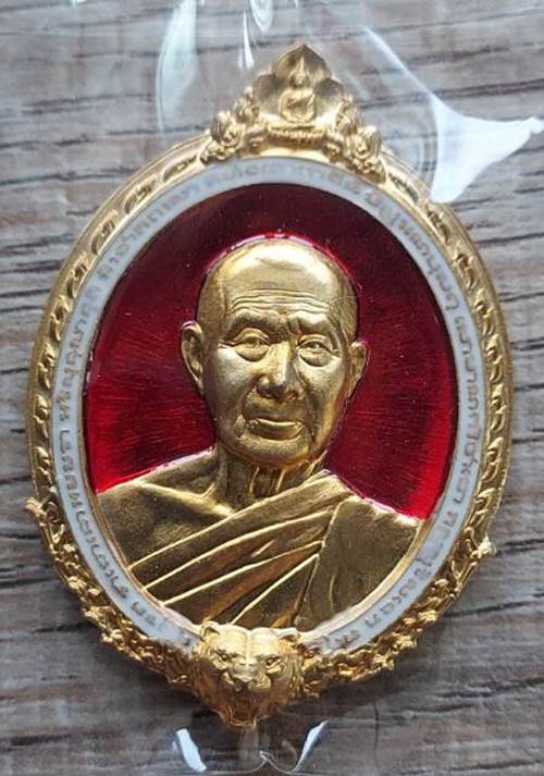 เหรียญบูรพาพยัคฆ์ หลวงพ่อรวย วัดมาบตาพุด จ.ระยอง เนื้อสัตตะพื้นแดง ขอบขาว ปี 2564