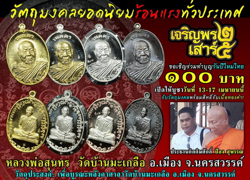 | เนื้อเงินลงยาจีวรเหลืองฝังเพชร หมายเลข ๓๐ จัดสร้าง ๙ องค์ นับเป็นหนึ่งในเนื้อพิเศษของรุ่นนี้ครับ (จากชุดกรรมการฝังอัญมณี ๙๙ องค์ เฉพาะลงท้ายด้วยเลขศูนย์ ทำการลงยาจีวรเหลืองและฝังเพชร) เหรียญเจริญพร๒ เสาร์๕ รวมเนื้อเงินทุกรายการจัดสร้าง ๔๐๖ เหรียญ รวมทุกเนื้อทุกรายการจัดสร้าง ๑๑,๖๗๐ เหรียญ เหรียญเจริญพร๒ เสาร์๕ เป็นรุ่นที่นิยมมากๆอีกรุ่นของหลวงพ่อสุนทร เต็มเปี่ยมด้วยพุทธคุณ งดงามมากมายด้วยพุทธศิลป์ ในช่วงนี้ทุกท่านสามารถมีครอบครองได้ในราคาที่สมเหตุผล ในอนาคตไม่แน่นอน อาจจะยากเกินไขว่คว้าก็เป็นได้ หลายๆคนที่ได้สัมผัสกับหลวงพ่ออย่างใกล้ชิดจะทราบดีว่าหลวงพ่อท่านมีความเมตตามากๆ ยากจะหาใครเทียบเคียงได้ ท่านเมตตาต่อทุกคนเสมอภาค สามารถเข้าพบกราบไหว้ขอพรได้ง่ายๆ ท่านดูแลพระและเณร มากกว่า ๗๐ รูป ดูแลเด็กนักเรียนอีกประมาณ๕๐๐ คน ได้ให้โอกาสทางการศึกษาแก่ทุกคน แบบเรียนกินอยู่ฟรี ค่าใช้จ่ายประจำวันสูงมากและท่านได้ทำมานานแล้ว โดยส่วนตัวเห็นตรงกันกับหลวงพ่อ ที่ท่านมองการณ์ไกล การให้การศึกษาแก่ทุกคน เป็นการให้สิ่งที่ยั่งยืนที่สุดแล้วสำหรับทุกคน ไม่ต้องใช้ปัจจัยอะไรเลย ก็สามารถมาเล่าเรียนอยู่กับหลวงพ่อได้ สมดังชื่อวัด วัดท่าพระเจริญพรต เป็นหนึ่งในวัดไม่กี่แห่งของประเทศไทยเลยก็ว่าได้ ที่ค่าใช้จ่ายภายในวัดที่สูงมาก ไม่มีการสนับสนุนจากส่วนกลางแต่ สามารถทำได้ด้วยความเมตตาของหลวงพ่อสุนทร ทุกคนเห็นความตั้งใจของหลวงพ่อจึงช่วยสนับสนุนหลวงพ่อให้ฟันฝ่ามาจนได้ถึงทุกวันนี้ เคยอ่านประวัติด้านการศึกษาของหลวงพ่อ ท่านมีความพยายามในการหาที่ศึกษาหาความรู้แต่ถูกปฏิเสธถึงสองแห่ง และกว่าจะได้เรียนก็ผ่านระยะเวลาพอสมควร ท่านจึงไม่อยากให้ผู้มีความตั้งใจไฝ่เรียนได้เสียโอกาสอย่างที่ท่านเคยพบเจอมา พิธีพุทธาภิเษกเจริญพร๒ เสาร์๕ และเมตตา เสาร์๕ ณ อุโบสถเก่า ๖๑๘ ปี หลวงพ่อโตศักดิ์สิทธิ์ เวลา มหามงคลฤกษ์ โดยท่านเจ้าคุณพระนิโรธรักขิต (หลวงพ่อสุนทร) ผู้เต็มเปี่ยมด้วยเมตตา วาระแรก เป็นเสาร์๕ วันธงชัย นับเป็นมหามงคลฤกษ์ ไม่ได้เกิดขึ้นบ่อยๆครับ นานๆมีครั้งกับวันดีๆ วันเสาร์ห้าใหญ่ รอบนี้ตรงกับวันที่๑ เมษายน ๒๕๖๐ ตรงกับวันเสาร์ เดือน๕ ขึ้น๕ ค่ำ ปีระกา เป็นวันดี วันธงชัย ฤกษ์มงคล เป็นมงคลทุกอย่าง หากมีการพุทธาภิเษกวัตถุมงคล จะมีพุทธคุณทุกด้านมากเป็นพิเศษกว่าวันทั่วไป แคล้วคลาด คงกระพัน เมตตา โชคลาภ มาเต็มเป็นพิเศษ ความเป็นพิเศษมากๆ ที่ในรอบร้อยปีอาจไม่เจอเลย คือตรงกับวันที่ ๑ โอกาสเกิดได้ย