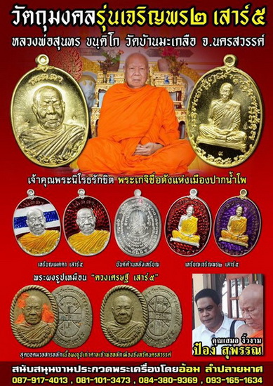 | เนื้อเงินลงยาจีวรสีม่วง หมายเลข ๑๙ จัดสร้าง ๒๙ องค์ (จากรายการทำบุญ๑๐๐บาท) เหรียญเจริญพร๒ เสาร์๕ รวมเนื้อเงินทุกรายการจัดสร้าง ๔๐๖ เหรียญ รวมทุกเนื้อทุกรายการจัดสร้าง ๑๑,๖๗๐ เหรียญ เหรียญเจริญพร๒ เสาร์๕ เป็นรุ่นที่นิยมมากๆอีกรุ่นของหลวงพ่อสุนทร เต็มเปี่ยมด้วยพุทธคุณ งดงามมากมายด้วยพุทธศิลป์ ในช่วงนี้ทุกท่านสามารถมีครอบครองได้ในราคาที่สมเหตุผล ในอนาคตไม่แน่นอน อาจจะยากเกินไขว่คว้าก็เป็นได้ หลายๆคนที่ได้สัมผัสกับหลวงพ่ออย่างใกล้ชิดจะทราบดีว่าหลวงพ่อท่านมีความเมตตามากๆ ยากจะหาใครเทียบเคียงได้ ท่านเมตตาต่อทุกคนเสมอภาค สามารถเข้าพบกราบไหว้ขอพรได้ง่ายๆ ท่านดูแลพระและเณร มากกว่า ๗๐ รูป ดูแลเด็กนักเรียนอีกประมาณ๕๐๐ คน ได้ให้โอกาสทางการศึกษาแก่ทุกคน แบบเรียนกินอยู่ฟรี ค่าใช้จ่ายประจำวันสูงมากและท่านได้ทำมานานแล้ว โดยส่วนตัวเห็นตรงกันกับหลวงพ่อ ที่ท่านมองการณ์ไกล การให้การศึกษาแก่ทุกคน เป็นการให้สิ่งที่ยั่งยืนที่สุดแล้วสำหรับทุกคน ไม่ต้องใช้ปัจจัยอะไรเลย ก็สามารถมาเล่าเรียนอยู่กับหลวงพ่อได้ สมดังชื่อวัด วัดท่าพระเจริญพรต เป็นหนึ่งในวัดไม่กี่แห่งของประเทศไทยเลยก็ว่าได้ ที่ค่าใช้จ่ายภายในวัดที่สูงมาก ไม่มีการสนับสนุนจากส่วนกลางแต่ สามารถทำได้ด้วยความเมตตาของหลวงพ่อสุนทร ทุกคนเห็นความตั้งใจของหลวงพ่อจึงช่วยสนับสนุนหลวงพ่อให้ฟันฝ่ามาจนได้ถึงทุกวันนี้ เคยอ่านประวัติด้านการศึกษาของหลวงพ่อ ท่านมีความพยายามในการหาที่ศึกษาหาความรู้แต่ถูกปฏิเสธถึงสองแห่ง และกว่าจะได้เรียนก็ผ่านระยะเวลาพอสมควร ท่านจึงไม่อยากให้ผู้มีความตั้งใจไฝ่เรียนได้เสียโอกาสอย่างที่ท่านเคยพบเจอมา พิธีพุทธาภิเษกเจริญพร๒ เสาร์๕ และเมตตา เสาร์๕ ณ อุโบสถเก่า ๖๑๘ ปี หลวงพ่อโตศักดิ์สิทธิ์ เวลา มหามงคลฤกษ์ โดยท่านเจ้าคุณพระนิโรธรักขิต (หลวงพ่อสุนทร) ผู้เต็มเปี่ยมด้วยเมตตา วาระแรก เป็นเสาร์๕ วันธงชัย นับเป็นมหามงคลฤกษ์ ไม่ได้เกิดขึ้นบ่อยๆครับ นานๆมีครั้งกับวันดีๆ วันเสาร์ห้าใหญ่ รอบนี้ตรงกับวันที่๑ เมษายน ๒๕๖๐ ตรงกับวันเสาร์ เดือน๕ ขึ้น๕ ค่ำ ปีระกา เป็นวันดี วันธงชัย ฤกษ์มงคล เป็นมงคลทุกอย่าง หากมีการพุทธาภิเษกวัตถุมงคล จะมีพุทธคุณทุกด้านมากเป็นพิเศษกว่าวันทั่วไป แคล้วคลาด คงกระพัน เมตตา โชคลาภ มาเต็มเป็นพิเศษ ความเป็นพิเศษมากๆ ที่ในรอบร้อยปีอาจไม่เจอเลย คือตรงกับวันที่ ๑ โอกาสเกิดได้ยากมาก ความเป็นพิเศษมากๆอีก คือตรงกับข้างขึ้น และเป็นวันธงชัย ส่วนนักษัตร ปีระกา ปีไก่ทอง ก็ดีมากๆ รวมกับข้างขึ้