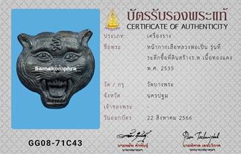 | หน้ากากเสือ หลวงพ่อเปิ่น วัดบางพระ รุ่นที่ระลึกซื้อที่ดินสร้างโรงพยาบาล ปี2535 พร้อมบัตรรับรองพระแท้สมาคม |