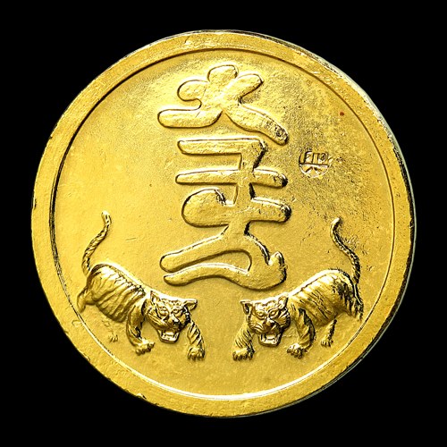 เหรียญเจ้าพ่อเสือ รุ่นสร้างตำหนักปู่ตั่วเหล่าเอี้ย รุ่นแรก กะหลั่ยทองลงยาสีฟ้า ปี2515 ล.ป.โต๊ะปลุก