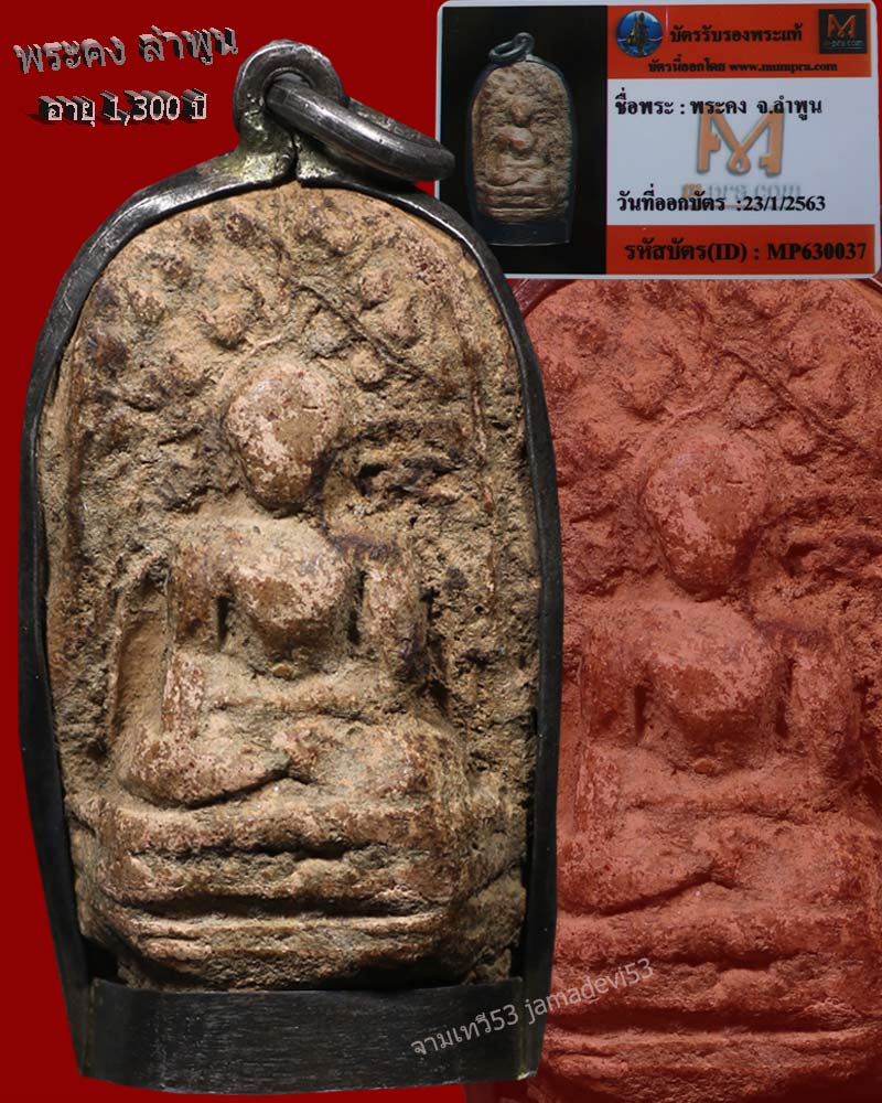 | พระคงลำพูน กรุเก่า (โพธิ์ 21 ใบ) พระคงลำพูน กรุเก่า เลี่ยมกระเช้านากโบราณ..ฟอร์มใหญ่-ฟอร์มตรง สวยสมบูรณ์เดิมๆ-โพธิ์เด้งๆ-ไม่อุด-ไม่ซ่อม..องค์นี้..มีเนื้อเกินด้านข้าง พร้อมใบโพธื์เกินมาอีก 1 ใบ (ที่ว่ากันว่า "มีเหลือ..คือเหลือกิน..เหลือใช้" พร้อมแถมใบโพธิ์ใบที่ 21 อีก, อยู่ข้างซุ้ม-ซ้ายมือองค์พระ-ขวามือเราครับ..) นับว่าหาพบได้ยากที่สุด..แทบจะพูดได้ว่ามีเพียงหนึ่งเดียวในโลกจริงๆครับ.. รับประกันความแท้ตลอดชีวิต..(พร้อมบัตรรับรองพระแท้จาก.."มุมพระ-www.mumpra.com" ..โดย "วัฒน์ รัชดา") +++++++++++++++++++++++++++++++++++++++++++++++++++++++++++++++++++++++++++++++++++++++++++++++++++++++++++++++++++++++++ -พระคง ลำพูน เป็นพระเนื้อดินเผาที่มีอายุการสร้างประมาณ ๑,๒๐๐ ปี ขุดพบตามวัดเก่าต่างๆ ในเมืองลำพูน และมีหลักฐานใหม่บ่งบอกชัดเจนว่า เป็นพระเครื่องที่มีอายุการสร้างราวพุทธศตวรรษที่ ๑๓-๑๔ โดยพิจารณาจากลักษณะของศิลปะและฝีมืองานช่าง สรุปได้ว่า พระคง พระบาง และ พระเปิม เป็นพระพิมพ์ที่แสดงลักษณะศิลปะอินเดีย แบบคุปตะ และปาละ ด้วยเหตุนี้ จึงทำให้ พระคง พระบาง และ พระเปิม ได้รับความนิยมมากขึ้น และมีราคาสูงขึ้นมาอย่างต่อเนื่อง คอลัมน์ “ปกิณกะพระเครื่อง” วันนี้จะเน้นกล่าวถึง ที่มาการสร้างพระคง ลำพูน (รวมถึงพระบาง พระเปิม) โดย ศ.ดร.ผดุงศักดิ์ รัตนเดโช คณะวิศวกรรมศาสตร์ ม.ธรรมศาสตร์ ผู้สนใจศึกษาและเก็บสะสม พระสกุลลำพูน มาหลายปี และมีพระสกุลนี้องค์สวยแชมป์อยู่ในครอบครองหลายสิบองค์ ได้มาให้ข้อมูลประกอบ พร้อมภาพพระสวยสภาพแชมป์ ให้ท่านผู้อ่านได้ชมกันในทุกมุมทุกด้านอย่างจุใจ ศ.ดร.ผดุงศักดิ์ รัตนเดโช ให้ข้อมูลว่า...สันนิษฐานว่า พระคง ลำพูน องค์ต้นแบบแกะจากหิน ซึ่งคาดว่ามีเพียงองค์เดียวเท่านั้น เช่นเดียวกับกรณี พระบาง และ พระเปิม แล้วนำองค์ต้นแบบนี้ไปกดถ่ายพิมพ์บนแผ่นดินดิบ จึงได้ “แม่พิมพ์เว้า” หรือเบ้าพิมพ์หลายๆ ตัว (ที่เรียกว่า “แม่พิมพ์ตัวเมีย” เหมือนกับแม่พิมพ์ครั่ง ที่ใช้สร้างพระหลวงพ่อทวด เนื้อว่าน รุ่นแรก) จากนั้นนำเบ้าพิมพ์นี้ไปเผาเพื่อเพิ่มความแกร่งให้แม่พิมพ์นี้ ซึ่งแน่นอนว่า แม่พิมพ์นี้ที่นำไปกดเนื้อดินเพื่อสร้างองค์พระ คงมีจำนวนมาก เพื่อที่สามารถผลิตองค์พระจำนวนมากๆ ได้ การกดเนื้อดินดิบลงในเบ้าพิมพ์นี้เป็นการกดด้วยมือ เพราะมีลายนิ้วมือหลังองค์พระอย่างชัดเจน และมีการงัดองค์พระจากเบ้าพิมพ์พร้อมปาดก้นจนเห็นเป็นลักษณะรอยพับ กับรอยลายมืออย่างชัดเจน (แต่ที่เห็นไม่ชัดก็มี) และหากพิจารณาตามเจตคติของผู้สร้างสมัยโบราณแล้ว น่าจะมีการผสมเนื้อว่าน ๑๐๘ ลงไปผสมในดินดิบดังกล่าวด้วย เพื่อเพิ่มคว
