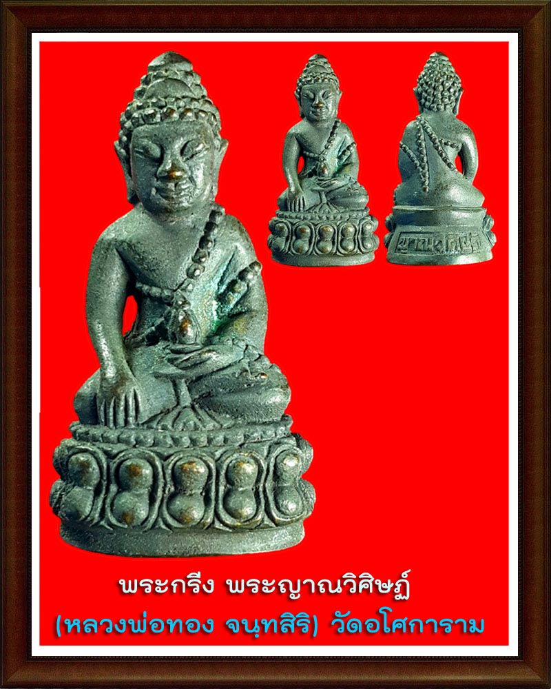 | พระกริ่ง พระญาณวิศิษฏ์ (หลวงพ่อทอง จนฺทสิริ) พระผู้ปฏิบัติดีปฏิบัติชอบ http://www.dhammajak.net/forums/viewtopic.php?t=20953&f=13 ประวัติท่านครับ.. สวยเดิม ครับ ปกติ เจอแต่ เนื้อทองทิพย์ องค์นี้ สวยมาก และ ทรงคุณค่า แห่ง พระกริ่ง ของ พระเกจิ ยุคปัจจุบัน ((((( พระกริ่งญาณวิศิษฏ์ หลวงพ่อทอง วัดอโศการาม หลวงพ่อทองท่านสร้างพระกริ่งไว้แจกให้กับพระที่บวชและมาจำพรรษาที่วัดรวมถึงญาตฺโยมที่มาร่วมงานและมากราบท่านที่วัดด้วยครับ หายากครับ คนในพื้นที่หากันมากใครมีก็เก็บเงียบกันหมดครับ ประวัติ พระญาณวิศิษฏ์ หรือ หลวงพ่อทอง จนฺทสิริ ท่านเกิดเมื่อวันที่ 28 เมษายน พ.ศ. 2475 ตรงกับรัชสมัยของพระบาทสมเด็จพระปกเกล้าเจ้าอยู่หัว รัชกาลที่ 7 แห่งราชวงศ์จักรี ณ พื้นเพเดิมครอบครัวเป็นชาวจังหวัดอุบลราชธานี มีพี่น้องร่วมบิดามารดาด้วยกันทั้งหมด 9 คน เป็นชาย 4 คน หญิง 5 คน ท่านเป็นบุตรคนที่ 6 ต่อมาครอบครัวอพยพย้ายถิ่นฐานมาปักหลักอยู่ ณ ต.วังใหญ่ อ.ท่าตะโก จ.นครสวรรค์ ท่านเป็นเจ้าอาวาสรูปที่ 3 และเป็นเจ้าอาวาสรูปปัจจุบันของวัดอโศการาม โดยได้รับสถาปนาตำแหน่งสืบต่อจาก พระเทพโมลี (สำรอง คุณวุฑฺโฒ) ในชีวิตวัยเยาว์ของท่าน ท่านศึกษาจบชั้นเพียงชั้นประถมศึกษาปีที่ 4 ต้องเลิกเรียนกลางคันเพื่อมาช่วยเหลือทางบ้านทำนาหาเลี้ยงปากท้อง บรรพชา อุปสมบท ท่านได้บรรพชาเป็นสามเณรเมื่อปี พ.ศ. 2494 ขณะมีอายุได้ 19 ปี ณ วัดป่าคลองกุ้ง ต.ตลาด อ.เมือง จ.จันทบุรี จนกระทั่งเมื่อมีอายุได้ 21 ปี ท่านได้อุปสมบทเป็นพระภิกษุเมื่อปี พ.ศ. 2496 ก่อนย้ายไปพักจำพรรษาอยู่ที่วัดเขาแก้ว ต.หนองตาคง อ.โป่งน้ำร้อน จ.จันทบุรี ปฏิบัติธรรม ผู้ที่คอยชี้ทางส่งเสริมให้ท่านได้เข้าสู่ร่มกาสาวพัสตร์ ไม่ใช่ใครอื่นที่ไหน คือ พระสุทธิธรรมรังสีคัมภีรเมธาจารย์ (ลี ธมมฺธโร) หรือท่านพ่อลี ธมฺมธโร ผู้ซึ่งมีศักดิ์เป็นอาแท้ๆ นั่นเอง[2] หลวงพ่อทอง ได้ศึกษาวิชาความรู้จากท่าน ถึงแม้ว่าท่านจะเคยศึกษาวิชาบาลีที่กรุงเทพ ฯ มาแล้วก็ตาม จนมาถึงปี พ.ศ. 2500 ไปจำพรรษาที่สำนักสงฆ์บ้านสันกอเก็ด ต.บ้านกลาง อ.สันป่าตอง จ.เชียงใหม่ เป็นเวลา 3 ปี กระทั่งท่านพ่อลีได้มรณภาพลง ท่านจึงได้กลับมาอยู่ที่วัดอโศการาม และท่านได้รับตำแหน่งเจ้าอาวาสวัดอโศการามเมื่อปี พ.ศ. 2534 จนถึงปัจจุบัน ในด้านพระธรรม หลวงพ่อทองท่านมักจะเน้นเรื่องการปฏิบัติวิปัสสนากรรมฐาน และท่านก็เคยกล่าวไว้ว่า การฝึกธรรมมะ ต้องรู้จักการฝึกความอดทนไว้ก่อน และต้องมีสติด้วย เพราะมนุษย์ ไม่มีจุดยืนในความคิด ชอบใช้สติปัญญาของตนไปตัดสินโดยการสังหารกิเลสของตนเอง เมื่อสมาธิเป็นสมถะจิตจะบังเกิดควา