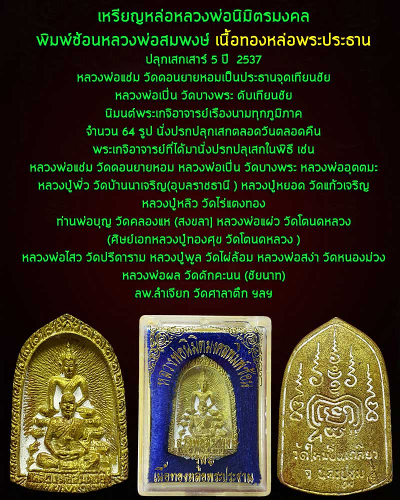 | เหรียญหล่อหลวงพ่อนิมิตรมงคล พิมพ์ซ้อนหลวงพ่อสมพงษ์ วัดใหม่ปิ่นเกลียว เนื้อทองหล่อพระประธาน ปี 2537 มีหลวงพ่อแช่ม วัดดอนยายหอมเป็นประธานจุดเทียนชัย หลวงพ่อเปิ่น วัดบางพระ ดับเทียนชัย นิมนต์พระเกจิอาจารย์เรืองนามทุกภูมิภาค จำนวน 64 รูป นั่งปรกปลุกเสกตลอดวันตลอดคืน พระเกจิอาจารย์ที่ได้มานั่งปรกปลุเสกในพิธี เช่น หลวงพ่อแช่ม วัดดอนยายหอม หลวงพ่อเปิ่น วัดบางพระ หลวงพ่ออุตตมะ วัดวังวิเวการาม หลวงปู่พั่ว วัดบ้านนาเจริญ(อุบลราชธานี ) หลวงปู่หยอด วัดแก้วเจริญ หลวงปู่หลิว วัดไร่แตงทอง ท่านพ่อบุญ วัดคลองแห (สงขลา] หลวงพ่อแผ่ว วัดโตนดหลวง (ศิษย์เอกหลวงปู่ทองศุข วัดโตนดหลวง ) หลวงพ่อไสว วัดปรีดาราม หลวงปู่พูล วัดไผ่ล้อม หลวงพ่อสง่า วัดหนองม่วง หลวงพ่อผล วัดดักคะนน (ชัยนาท) หลวงพ่อลำเจียก วัดศาลาตึกเป็นต้น |