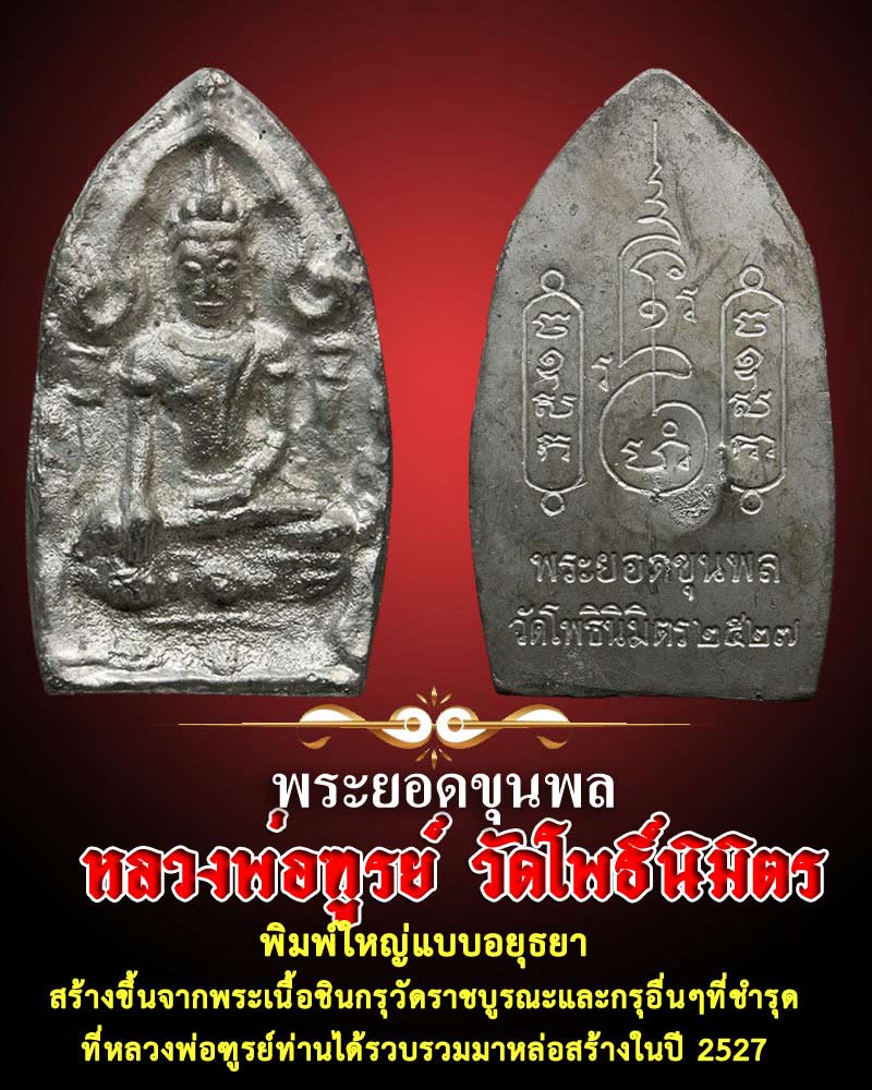 | พระยอดขุนพล หลวงพ่อฑูรย์ วัดโพธิ์นิมิตร พิมพ์ใหญ่แบบอยุธยา พระหล่อ องค์นี้เป็นพระพิมพ์ใหญ่ ถอดพิมพ์มาจากยอดขุนพลรุ่นเก่า สร้างขึ้นจากพระเนื้อชินกรุวัดราชบูรณะและกรุอื่นๆที่ชำรุด ที่หลวงพ่อฑูรย์ท่านได้รวบรวมมาสร้างในปี 2527 พระชุดยอดขุนพล ได้รับการยกย่องและยอมรับ ทางด้านพุทธคุณว่าโดดเด่น ด้านมหาอำนาจ แคล้วคลาด คงกระพัน ชาตรี ดีเลิศสุดยอดยิ่ง พระยอดขุนพล เชื่อกันว่าเป็นพระประเภท มหาอำนาจ มีอานุภาพ คงกระพันชาตรี และแคล้วคลาด เป็นเลิศ ได้มีการค้นพบจากหลายๆ กรุในเมืองต่างๆ เช่น เมืองลพบุรี เมืองเพชรบุรี เมืองกำแพงเพชร เมืองชัยนาท และเมืองอยุธยา เป็นต้น พระเนื้อชินคือพระเครื่องที่สร้างด้วยโลหะผสม โดยมีตะกั่วเป็นวัสดุหลัก และมีโลหะอื่น เช่น ดีบุกผสม หากมีปริมาณตะกั่วอยู่มาก พระพิมพ์ที่ได้จะมีความอ่อนตัว บิดงอได้ง่าย เรียกว่า "ชินอ่อน" หรือ "ชินตะกั่ว" ถ้ามีดีบุกผสมอยู่มาก พระพิมพ์จะมีความแข็งมากกว่า ผิวเป็นประกายคล้ายโลหะเงิน จึงมักเรียกกันว่า "ชินกรอบ" หรือ "ชินเงิน" ในสมัยก่อน เมื่อพูดถึงพระเนื้อชินที่มีชื่อเสียงโด่งดังในทางแคล้วคลาด คงกระพัน มักจะนึกถึงพระพิมพ์สามชนิดด้วยกัน คือ พระร่วงรางปืน พระลพบุรีหูยาน และพระท่ากระดาน ซึ่งถูกจัดให้เป็นชุด "ไตรภาคีแห่งอิทธิฤทธิ์" หลวงพ่อฑูรย์ อตฺตทีโป เจ้าอาวาสวัดวัดโพธินิมิตรสถิตมหาสีมาราม แขวงบางยี่เรือ เขตธนบุรี กทม. ท่านเป็นศิษย์รัก ของ สมเด็จพุฒาจารย์นวม วัดอนงค์ หลวงพ่อฑูรย์ ท่านมีความสามารถ ทางด้าน ปฏิบัติภาวนา และเป็นพระที่มีอายุยืนรูปหนึ่งในราว พ .ศ. 2482– 2483 หลวงพ่อฑูรย์ ท่านเป็นเกจิเก่งอีกองค์หนึ่งในยุคกึ่งพุทธกาล ท่านสร้างพระไว้เป็นจำนวนมากมายหลายแบบ ในการอธิษฐานจิตปลุกเสกสร้างพระในแต่ละครั้ง ท่านจะนิมนต์พระเกจิคณาจารย์ มาร่วมอธิฐานจิตจากทั่วประเทศ โดยเฉพาะเกจิที่มีความสนิทสนมกับท่าน |