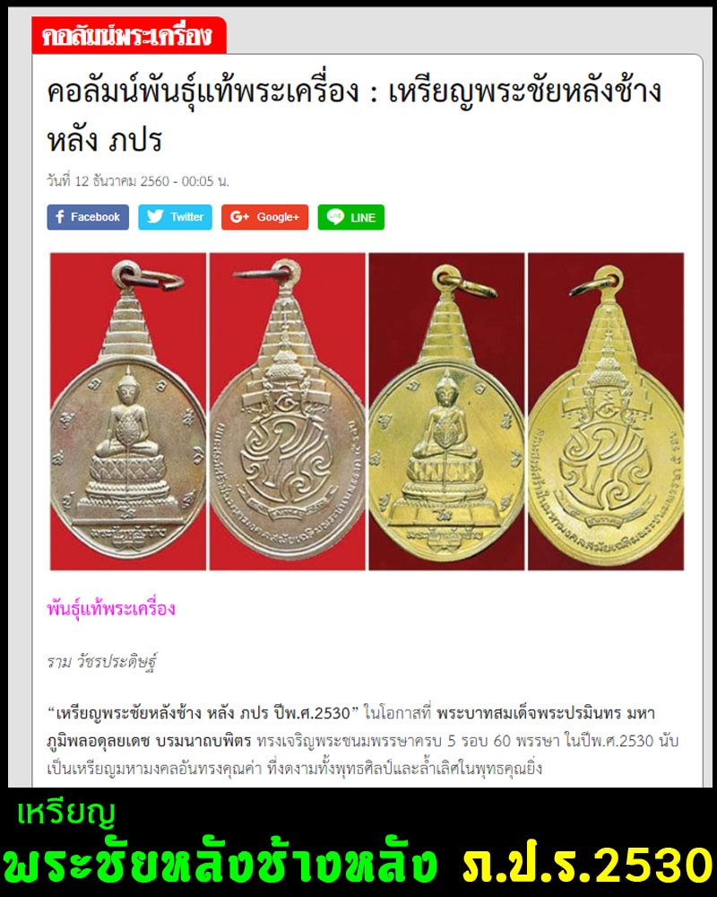 | ชื่อพระเครื่อง | เหรียญพระชัยหลังช้าง หลัง ภปร ปีพ.ศ.2530 |