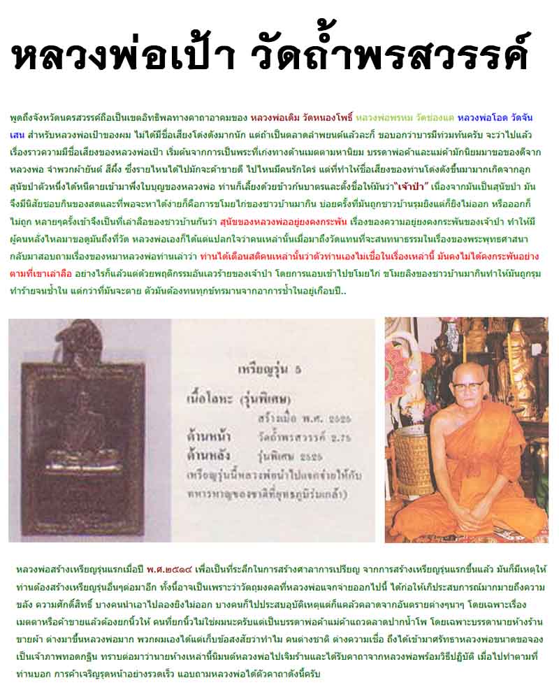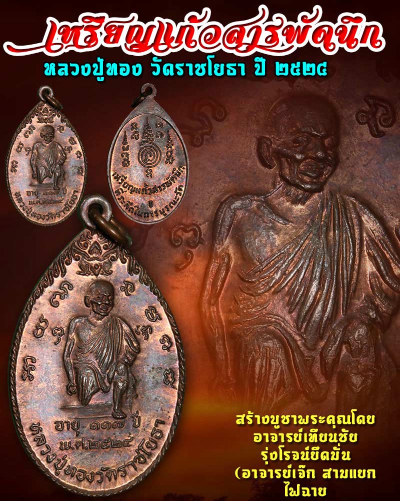 | เหรียญแก้วสารพัดนึก หลวงปู่ทอง วัดราชโยธา ปี 2524 เนื้อสัมฤทธิ์ ผสมชนวนเก่า ของดี มีประสบการณ์ สร้างบูชาพระคุณโดย อาจารย์เทียนชัย รุ่งโรจน์ยึดมั่น (อาจารย์เจ๊ก สามแยก ไฟฉาย) อาจารย์เจ๊กถือได้ว่าเป็นศิษย์รุ่นสุท้าย ของหลวงปู่ทอง วัดราชโยธา ผู้ทรงคุณวิเศษอภินิหารนานาประการ จะนับว่าท่านเป็นศิษย์ร่วมสำนักของ หลวงพ่อเผือก วัดกิ่งแก้ว หลวงพ่อเผย วัดบางหญ้าแพรก และอาจารย์แก้ว คำวิบูลย์ ก็ไม่ผิด เหรียญรุ่นแรกแก้วสารพัดนึกนี้ อาจารย์เจ๊กได้นำเอาชนวนเก่าของหลวงปู่ทององค์อาจารย์ และชนวนเก่าต่างๆๆ ที่ท่านเคยสร้างพระไปแล้วหลายครั้งมาหลอมรวมกันเป็นเนื้อสัมฤทธิ์ อัญเชิญรูปเก่าของหลวงปู่ทองขณะกำลังลงบันไดมาเป็นต้นแบบ ลงมือปั้มจนเรียบร้อยและประกอบพิธีมังคลาภิเษกจนจบบริบรูณ์ในปี พ.ศ. 2524 ตอนที่สร้างเหรียญรุ่นนี้ อาจารย์เจ๊กก็มีอายุถึง 71ปีแล้ว เมื่อแจกจ่ายออกไปก็ปรากฏอภินิหารด้วยบารมีธรรมของหลวงปู่ทอง อายะนะ มากมายเกินจะบันทึกได้ ทั้งเมตตา ค้าขาย คงกระพัน มหาอุด กันผีปรีศาจ สารพัดที่คนแขวนจะไปพบเจอต่างก็นำมาเล่าให้อาจารย์เจ๊กฟังที่สำนัก จึงถือได้ว่าเป็นของดีราคาย่อมเยา ทีมีพุทธคุณสูงล้ำคุ้มครองตัวได้อย่างแน่นอน |