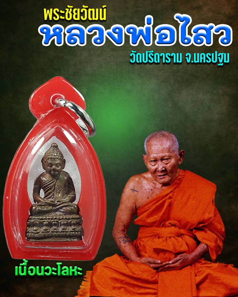 | พระชัยวัฒน์ หลวงพ่อไสว วัดปรีดาราม จ.นครปฐม เนื้อนวะโลหะ สวยเดิม เลี่ยมพร้อมใช้ หลวงพ่อไสว อดีตพระเกจิอาจารย์ชื่อดังเรืองเวทวิทยาคม ผู้ได้รับการขนานนามเทพเจ้าแห่งคลองจินดาเมืองสามพราน พุทธลักษณะพิมพ์ทรงสวยงามอลังการ เป็นพิมพ์สมาธิบัวสองชั้น ผสมชนวนเก่าศักดิ์สิทธิ์มากมาย เพื่อเป็นที่ระลึกในวาระฉลองอายุ 75 ปี หลวงพ่อไสวประกอบพิธีปลุกเสกอย่างเข้มขลังในปี 2539 บริเวณสังฆฏิตอกโค๊ต 75 ส่วนใต้ฐานตอกนาม ลพ ไสว เพื่อป้องกันการปลอมแปลง |
