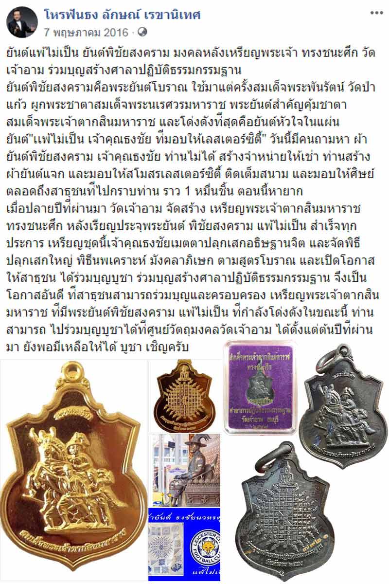 | เหรียญพระเจ้าตากสิน ทรงชนะศึก วัดเจ้าอาม โหรฟันธง ลักษณ์ เรขานิเทศ 7 พฤษภาคม 2016 · ยันต์แพ้ไม่เป็น ยันต์พิชัยสงคราม มงคลหลังเหรียญพระเจ้าตากสิน ทรงชนะศึก วัดเจ้าอาม ร่วมบุญสร้างศาลาปฏิบัติธรรมกรรมฐาน ยันต์พิชัยสงครามคือพระยันต์โบราณ ใช้มาแต่ครั้งสมเด็จพระพันรัตน์ วัดป่าแก้ว ผูกพระชาตาสมเด็จพระนเรศวรมหาราช พระยันต์สำคัญคุ้มชาตาสมเด็จพระเจ้าตากสินมหาราช และโด่งดังท่ีสุดคือยันต์หัวใจในแผ่นยันต์"เเพ้ไม่เป็น เจ้าคุณธงชัย ท่ีมอบให้เลสเตอร์ซิตี้" วันนี้มีคนถามหา ผ้ายันต์พิชัยสงคราม เจ้าคุณธงชัย ท่านไม่ได้ สร้างจำหน่ายให้เช่า ท่านสร้างผ้ายันต์แจก และมอบให้สโมสรเลสเตอร์ซิตี้ ติดเต็มสนาม และมอบให้ศิษย์ตลอดถึงสาธุชนท่ีไปกราบท่าน ราว 1 หมื่นชิ้น ตอนนี้หายาก เมื่อปลายปีท่ีผ่านมา วัดเจ้าอาม จัดสร้าง เหรียญพระเจ้าตากสินมหาราช ทรงชนะศึก หลังเรียญประจุพระยันต์ พิชัยสงคราม แพ้ไม่เป็น สำเร็จทุกประการ เหรียญชุดนี้เจ้าคุณธงชัยเมตตาปลุกเสกอธิษฐานจิต และจัดพิธีปลุกเสกใหญ่ พิธีนพเคราะห์ มังคลาภิเษก ตามสูตรโบราณ |