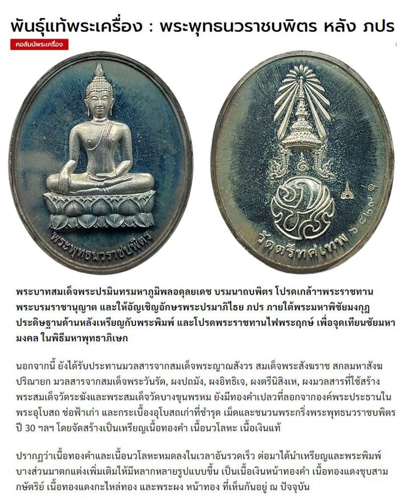 | เหรียญพระพุทธนวราชบพิตร วัดตรีทศเทพ เนื้อเงิน เดิม พระอยู่ในเลี่ยม ทำบุญมาแรง ครับ .. พระพุทธนวราชบพิตรหลัง ภปร (1)พันธุ์แท้พระเครื่อง www.arjanram.com ถามไถ่กันเข้ามามากมายหลายท่าน สำหรับ “เหรียญและพระผง พระพุทธ นวราชบพิตร วัดตรีทศเทพวรวิหาร” บางท่านก็สอบถามถึงประวัติ บางท่านก็อยาก เช่าบูชาเพื่อเก็บเป็น ที่ระลึกอันทรงค่า ก็นำมาลงเล่าสู่กันฟังอีกครั้ง เริ่มกันที่องค์ พระพุทธนวราชบพิตร พระประธาน ณ วัดตรีทศเทพ อันว่า “พระพุทธนวราชบพิตร” คือ พระนามของพระพุทธรูปในพระบาทสมเด็จ พระปรมินทรมหาภูมิพลอดุลยเดช บรมนาถบพิตร รัชกาลที่ 9 ที่ทรงสร้างพระราชทานไปยังทุกจังหวัดของไทยเพื่อเป็นมิ่งมงคลสูงส่งแก่อาณาประชาราษฎร์ แต่ “พระพุทธนวราชบพิตร วัดตรีทศเทพ” นั้น นับเป็นพระพุทธรูปขนาดใหญ่องค์แรกและองค์เดียวที่ได้รับพระบรม ราชานุญาตให้จำลองแบบจัดสร้างเพื่อเป็นพระประธานในพระอุโบสถ วัดตรีทศเทพ และพระราชทานพระนามว่า ‘พระพุทธนวราชบพิตร’ เช่นกัน ย้อนอดีตสมัยรัชกาลที่ 4 … พระเจ้าบรมวงศ์เธอ กรมหมื่นวิษณุนาถนิภาธร กราบบังคมทูลขอสร้าง ‘วัด’ ใกล้ ‘วัง’ ของพระองค์ ทรงโปรยเงินไปทั่วบริเวณที่ทรงต้องการ เหล่าไพร่ฟ้าจึงแผ้วถางป่านั้น จนเตียนโล่ง เพื่อเก็บหาเงิน อันเป็นกุศโลบาย ในการจ่ายค่าแรง แต่เริ่มก่อสร้างได้ไม่มากนัก ก็สิ้นพระชนม์ในปี พ.ศ.2404 ล้นเกล้าฯ รัชกาลที่ 4 ทรงพระกรุณาโปรดเกล้าฯ ให้ พระเจ้าบรมวงศ์เธอ กรมหมื่นมเหศวรศิววิลาส ดำเนินการสร้างสืบต่อ แต่ก็ยังไม่แล้วเสร็จ สิ้นพระชนม์ไปอีกพระองค์ ในปี พ.ศ.2410 จึงได้ทรงพระกรุณาโปรดเกล้าฯ ให้พระยาราชสงคราม อำนวยการสร้างต่อ จนแล้วเสร็จทันในปี พ.ศ.2410 นั้น ทั้งทรงให้สร้างพระพุทธปฏิมากร ปางสมาธิ ศิลปะสมัยรัตนโกสินทร์ หล่อด้วยโลหะผสม ขนาดหน้าตักกว้าง 2 ศอก 29 นิ้ว ถวายเป็นประธานในพระอุโบสถ ด้วยความเป็นวัดเก่าแก่ที่มีอายุนานนับศตวรรษ วัดตรีทศเทพได้รับการบูรณปฏิสังขรณ์สืบต่อเรื่อยมา กระทั่งประมาณปี พ.ศ.2528-2529 พระเทพวัชรธรรมาภรณ์ (สุรพงส์ ฐานวโร) อดีต เจ้าอาวาส จึงก่อสร้างพระอุโบสถหลังใหม่ เป็นอาคารทรงไทยตรีมุข ในการนี้ สมเด็จพระเทพรัตนราชสุดาฯ สยามบรมราชกุมารี เสด็จฯ ไปทรงประกอบพิธีวางศิลาฤกษ์ เมื่อวันที่ 25 พฤษภาคม และทรงรับเป็นองค์อุปถัมภ์ พระบาทสมเด็จพระปรมินทรมหาภูมิพลอดุลยเดช บรมนาถบพิตร ทรงมีพระมหากรุณาธิคุณโปรดเกล้าฯ ให้หล่อ พระพุทธนวราชบพิตร เพื่อประดิษฐานเป็นองค์พระประธานในพระอุโบสถ และเสด็จพระราชดำเนินเททองด้วยพระองค์เอง เมื่อวันที่ 19 สิงหาคม พ.ศ.2530 พร้อมด้วย สมเ