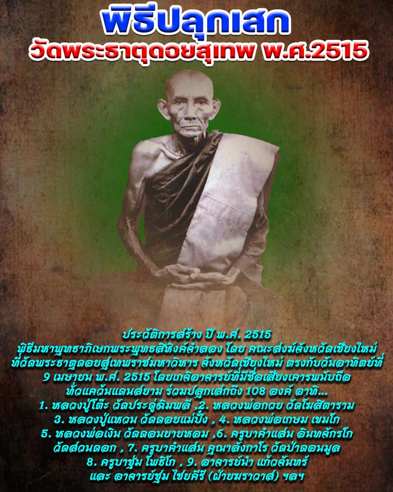 | เหรียญ ครูบาศรีวิชัย วัดพระธาตุดอยสุเทพ ปี 15 ราคาพิเศษ เท่ากันครับ ประวัติการสร้าง ปี พ.ศ. 2515 พิธีใหญ่ พิธีมหาพุทธาภิเษกพระพุทธสิหิงค์จำลอง โดย คณะสงฆ์จังหวัดเชียงใหม่ ที่วัดพระธาตุดอยสุเทพราชมหาวิหาร จังหวัดเชียงใหม่ ตรงกับวันอาทิตย์ที่ 9 เมษายน พ.ศ. 2515 โดยเกจิอาจารย์ที่มีชื่อเสียงเคารพนับถือ ทั่วแคว้นแดนสยาม ร่วมปลุกเสกถึง 108 องค์ อาทิ... 1. หลวงปู่โต๊ะ วัดประดู่ฉิมพลี 2. หลวงพ่อกวย วัดโฆสิตาราม 3. หลวงปู่แหวน วัดดอยแม่ปั๋ง 4. หลวงพ่อเกษม เขมโก 5. หลวงพ่อเงิน วัดดอนยายหอม 6. ครูบาคำแสน อินทจักรโก วัดสวนดอก 7. ครูบาคำแสน คุณาลังกาโร วัดป่าดอนมูล 8. ครูบาชุ่ม โพธิโก 9. อาจารย์นำ แก้วจันทร์ และ อาจารย์ชุม ไชยคีรี (ฝ่ายฆราวาส) ฯลฯ... สมเด็จย่า และสมเด็จพระนางเจ้าฯ เสด็จเป็นประธาน พุทธคุณแคล้วคลาด มหาอุตถ์และคงกระพัน เป็นเยี่ยม.. นับเป็นพิธีปลุกเสกที่ยิ่งใหญ่ที่สุดพิธีหนึ่งของจังหวัดเชียงใหม่เลยก็ว่าได้ พระรุ่นนี้ ลูกศิษย์สายหลวงพ่อกวย วัดโฆสิตาราม จ.ชัยนาท ตามหาเก็บกัน เพราะวัตถุมงคลที่ทันหลวงพ่อปลุกเสกฯ... พระเครื่องพิมพ์ต่างๆ ที่สร้างและปลุกเสกในพิธีเดียวกัน นอกจากเหรียญครูบาศรีวิชัยแล้ว ยังมีพระพิมพ์พระร่วงรางปืน พระกริ่งเชียงแสน , เหรียญพระพุทธสิหิงค์, เหรียญพระเจ้าเสตังคมณี วัดเชียงมั่น, เหรียญหลวงพ่อทันใจ, เหรียญเจ้าคุณพระราชสิทธาจารย์, เหรียญเจ้าคุณพระอภัยสารทะ วัดทุงยู... เหรียญครูบาศรีวิชัย หลังพระเจดีย์ วัดพระธาตุดอยสุเทพ ปี 2515 พิธีใหญ่ |