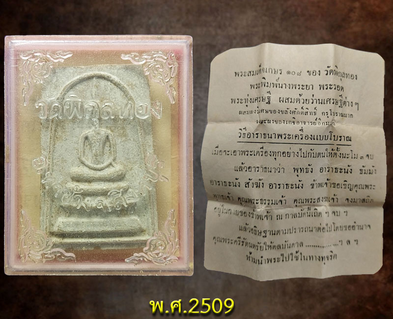 | พระสมเด็จเกษร108 หลังรูปเหมือน หลวงพ่อแพ วัดพิกุลทอง จ.สิงห์บุรี ปี 2509 เก่าเก็บเดิม ๆ คากล่อง พร้อมใบฝอย รุ่นเก่า ...พระยุคต้น ที่ได้รับความนิยม อีก หนึ่งพิมพ์ครับ (( สร้างก่อน แพพัน )) การสร้างวัตถุมงคลของหลวงพ่อแพ พระเดชพระคุณท่านเจ้าคุณ “พระธรรมมุนี” หรือที่พุทธศาสนิกชนรู้จักท่านเป็นอย่างดีในนามของ “หลวงพ่อแพ วัดพิกุลทอง” ท่านเริ่มสร้างวัตถุมงคลต่างๆ เป็นครั้งแรกเมื่อปี พ.ศ. ๒๔๘๒ เพื่อหาทุนสร้างพระอุโบสถวัดพิกุลทองที่กำลังชำรุดทรุดโทรม เนื่องจากสร้างมาตั้งแต่ปี พ.ศ. ๒๔๔๐ หลวงพ่อแพ ท่านจึงนำเรื่องก่อสร้างพระอุโบสถปรารภกับ “หลวงพ่อศรี เกสโร” วัดพระปรางค์ บางระจัน สิงห์บุรี ซึ่งเป็นพระอาจารย์ของท่าน หลวงพ่อศรีนั้นท่านเป็นพระภิกษุที่มีวิชาอาคมแกร่งกล้า มีชื่อเสียงลูกศิษย์ลูกหามากมายในยุคนั้น ได้แนะนำให้หลวงพ่อแพท่านสร้างพระกลีบบัว และแหวนชาย–หญิง โดยให้จัดสร้างเป็นเนื้อโลหะ สมนาคุณให้แก่ผู้บริจาคทรัพย์สร้างพระอุโบสถ ด้วยเหตุนี้ หลวงพ่อแพ ท่านจึงได้ร่ำเรียนวิชาการสร้าง และหล่อพระต่างๆ กับหลวงพ่อศรี ที่วัดพระปรางค์ ๑๕ วัน เพิ่มเติม หลังจากที่ก่อนหน้านั้นตอนอยู่กรุงเทพฯ ได้ศึกษาวิชาไสยเวทวิทยาคม จิตศาสตร์จากพระเกจิชื่อดังในกรุงเทพฯ โดยเฉพาะการหล่อพระกริ่ง เหรียญหล่อ ตามตำรับสมเด็จพระสังฆราช (แพ) วัดสุทัศน์, หลวงพ่อมุ้ย วัดสามปลื้ม ฯลฯ เมื่อศึกษาอย่างเข้าใจถ่องแท้แล้ว ก็ได้เดินทางกลับมาจัดพิธีหล่อพระขึ้นที่วัดพิกุลทอง เสร็จแล้วจึงนำไปถวายให้หลวงพ่อศรีปลุกเสก จนปรากฏกิตติคุณแห่งความเข้มขลัง ได้รับความนิยมจากพุทธศาสนิกชนเป็นอย่างยิ่ง วัตถุมงคลที่ท่านจัดสร้างขึ้นในครั้งนั้น ได้แก่ แหวนคุณพระ และ สมเด็จกลีบบัวแบบหยดน้ำ การสร้างแหวนคุณพระท่านได้ทำออกมา ๔ พิมพ์ด้วยกัน โดยพิมพ์แรกเป็นหัวสี่แหลี่ยม มีอักขระ ก.ข. พิมพ์ที่สองเป็นรูปข้าวหลามตัด พิมพ์ที่สามเป็นรูปองค์พระในกรอบสี่เหลี่ยม ส่วนพิมพ์ที่สี่ เป็นแหวนสำหรับสตรี ลักษณะคล้ายปลอกมีด หัวยันต์ อักขระยันต์ “นะ” มีรูปนางกวัก แหวนรุ่นนี้ เป็นเนื้อทองเหลืองผสมกับแผ่นทองแดง และการทำก็ไม่ได้หวังเพื่อความสวยงาม หากแต่มุ่งไปในทางด้านความขลัง เพื่อคนที่นำไปใช้ให้เกิดความศักดิ์สิทธิ์ พิมพ์ที่นำมาทำแหวนคุณพระนี้ หลวงพ่อแพท่านเป็นผู้แกะแม่พิมพ์เองจากหินมีดโกน หัวแหวนท่านจะแกะเป็นรูปสี่เหลี่ยมล้อมรอบพระปางสมาธิ ส่วนวงแหวนด้านใน จะแกะเป็นอีกพิมพ์หนึ่งต่างหาก ส่วน พระสมเด็จกลีบบัว หรือบางคนก็เรียกว่า สมเด็จหยดน้ำ เนื่องจากพร