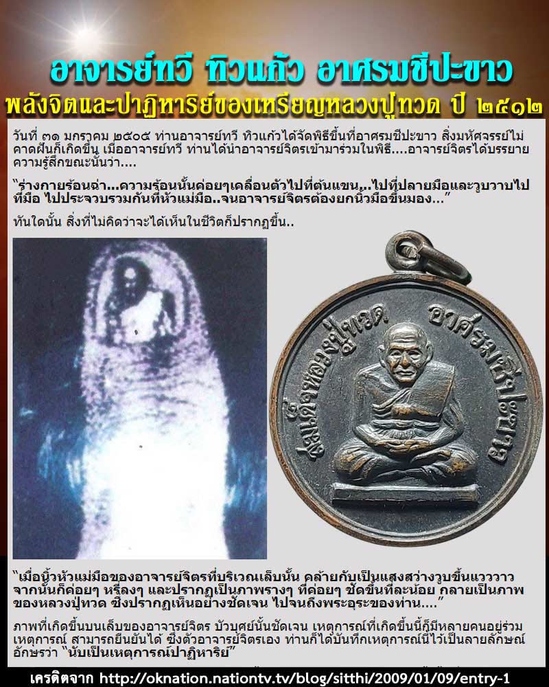| เหรียญสมเด็จหลวงปู่ทวด อาศรมชีปะขาว ปี 2512 เหรียญ ขลัง... ปรากฏการอภินิหารย์ แห่ง หลวงปู่ทวด.... อีกหนึ่งเหรียญดี ที่ ห้อยคอ ได้สนิทใจ เครดิตจาก คุณ ศิษย์กวง ข้อมูลรายละเอียดแบบ เต็ม ๆเวอร์ชั่น ติดตามอ่านได้ใน http://oknation.nationtv.tv/blog/sitthi/2009/01/09/entry-1 “เมื่อนิ้วหัวแม่มือของอาจารย์จิตรที่บริเวณเล็บนั้น คล้ายกับเป็นแสงสว่างวูบขึ้นแวววาว จากนั้นก็ค่อยๆ หรี่ลงๆ และปรากฏเป็นภาพรางๆ ที่ค่อยๆ ชัดขึ้นที่ละน้อย กลายเป็นภาพของหลวงปู่ทวด ซึ่งปรากฏเห็นอย่างชัดเจน ไปจนถึงพระอุระของท่าน....” ภาพที่เกิดขึ้นบนเล็บของอาจารย์จิตร บัวบุศย์นั้นชัดเจน เหตุการณ์ที่เกิดขึ้นนี้ก็มีหลายคนอยู่ร่วมเหตุการณ์ สามารถยืนยันได้ ซึ่งตัวอาจารย์จิตรเอง ท่านก็ได้บันทึกเหตุการณ์นี้ไว้เป็นลายลักษณ์อักษรว่า “นับเป็นเหตุการณ์ปาฏิหาริย์” ในพิธีอัญเชิญรูปหลวงปู่ทวดให้มาปรากฏบนนิ้วมือของอาจารย์จิตร บัวบุศย์ครั้งนี้ เพื่อใช้เป็นแบบในการสร้างพระรูปหลวงปู่ทวดจนเป็นที่สำเร็จ โดยครั้งแรกเป็นการสร้างพระเนื้อว่านมงคล ๑๐๘ ชนิด เมื่อมีการสร้างเสร็จแล้วได้นำมาแจกจ่ายให้กับลูกศิษย์ทั้งหลายได้บูชาและหมดไปอย่างรวดเร็ว... แต่ก็ยังไม่เพียงพอเนื่องจากลูกศิษย์ของท่านอาจารย์ทวี ทิวแก้วยังคงมีอีกเป็นจำนวนมาก ซึ่งแต่ละคนเมื่อได้รับไปบูชาแล้วต่างก็มีประสบการณ์มากมายทั้งแคล้วคลาดภยันตรายนับไม่ถ้วน ทำให้ผู้ที่ได้รับรู้เรื่องราวอันนี้อยากจะมีไว้บูชากันบ้าง.. ด้วยเหตุนี้อาจารย์ทวี ท่านจึงได้สร้าง “เหรียญหลวงปู่ทวด เหยียบน้ำทะเลจืด” เป็นเหรียญทรงกลมขึ้นอีกครั้งในปี ๒๕๑๒ เพื่อแจกจ่ายให้กับลูกศิษย์ของท่านเช่นเคย แต่ในครั้งนี้อาจารย์ทวี ท่านได้แบ่งเหรียญรุ่นนี้ส่วนหนึ่งเก็บไว้ในหีบเพื่อบูชาในพิธีต่างๆของท่าน ข้อมูลรายละเอียดแบบ เต็ม ๆเวอร์ชั่น ติดตามอ่านได้ใน http://oknation.nationtv.tv/blog/sitthi/2009/01/09/entry-1 |