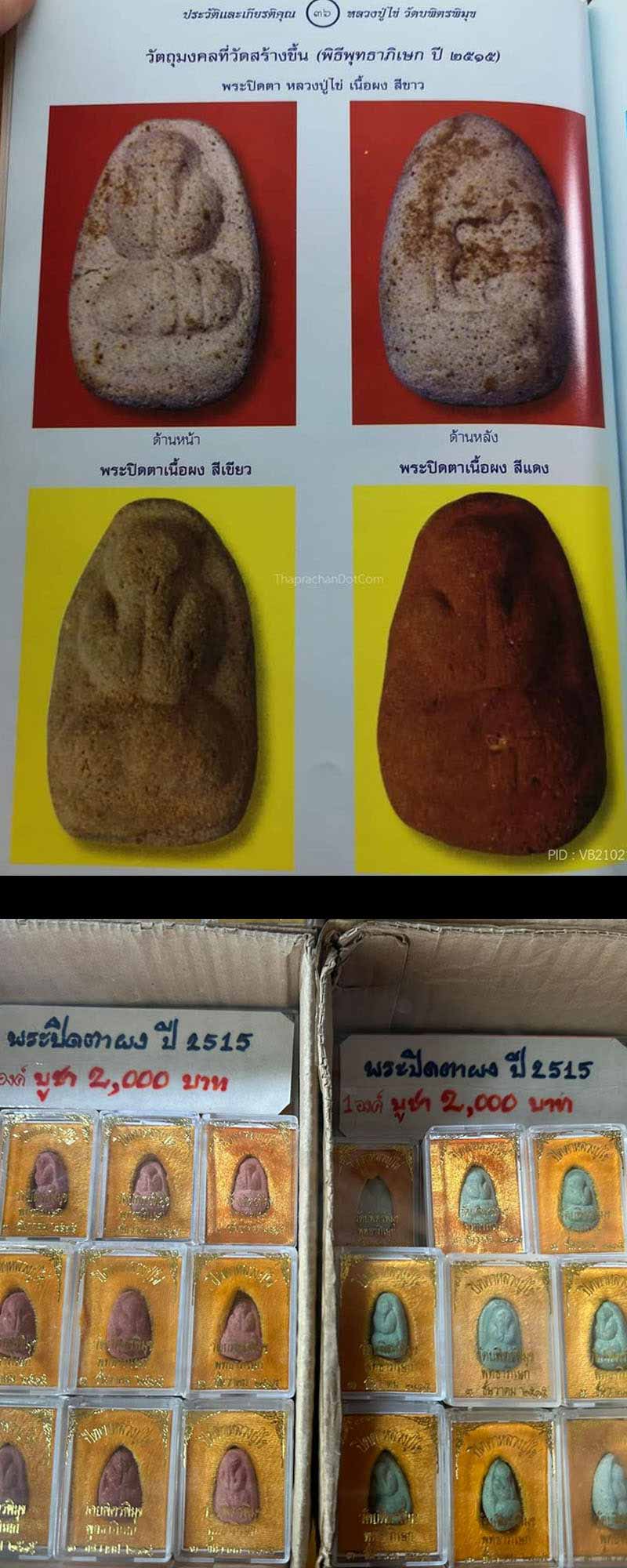 | พระปิดตาหลวงปู่ไข่ วัดเชิงเลน ปี 2515 สร้างพร้อมเหรียญ รุ่น 2 ปี 2515 (ราคาเหรียญ ว่ากันหลายพันครับ ) วัดออกให้ทำบุญ หลายปีมาแล้ว องค์ละ สองพันบาทครับ พิธีเสกใหญ่ สุดยอดพระเกจิ 56 รูป พิธีพุทธาภิเษกยิ่งใหญ่เมื่อ วันที่ 3-4 ธันวาคม 2515 โดยจัดพิธีตามแบบโบราณประเพณี ทุกประการ..อีกทั้งยังบวงสรวงดวงวิญญาณหลวงปู่ไข่ให้มารับรู้ด้วย โดยมีสมเด็จพระสังฆราช วัดพระเชตุพนวิมลมังคลาราม อธิษฐานจุดเทียนชัย มี พระเกจิอาจารย์ที่มีชื่อเสียงในยุคนั้นจากทั่วประเทศมาร่วมในพิธีมากมายถึง 56 รูป มีรายนามดังนี้ 1.พระเทพโสภณ(หลวงพ่อมหายม) วัดชนะสงคราม กทม. 2.พระเทพเวที(หลวงพ่อทองคำ) วัดมหาธาตุ กทม. 3.พระราชปัญญาโสภณ(หลวงพ่อสุข) วัดราชนัดดา กทม. 4.พระราชสุธี วัดสระเกศ กทม. 5.พระราชวรเมธี วัดสระเกศ กทม. 6.พระราชธรรมเมธี(หลวงพ่อบุญมา) วัดจักรวรรดิราชาวาส กทม. 7.พระอุดมสารโสภณ วัดเทพศิรินทร์ กทม. 8.พระสิริทัตสุนทร วัดพลับพลาไชย กทม. 9.พระอินทสมาจารย์(หลวงพ่อเงิน) วัดอินทรวิหาร กทม. 10.พระพุทธมนต์วราจารย์(หลวงพ่อสุพจน์) วัดสุทัตเทพวราราม กทม. 11.พระพิพัฒน์สังวรคุณ(หลวงพ่อสาย) วัดชัยชนะสงคราม กทม. 12.พระวิสุทธิสารโสภณ(หลวงพ่อทอง) วัดคณิกาผล กทม. 13.พระวิเชียรกวี วัดปากน้ำ กทม. 14.พระวุฒิญาณมุนี วัดนางนอง กทม. 15.พระโพธิวรคุณ(หลวงพ่อไพฑูรย์) วัดโพธิ์นิมิตร กทม. 16.พระรักขิตวันมุนี(หลวงพ่อถิร) วัดป่าเลไลย์ สุพรรณบุรี 17.พระสมุทรเมธาจาย์(หลวงพ่อแจ่ม) วัดด่านสำโรง สมุทรปราการ 18.พระครูวิริยกิตติ(หลวงปู่โต๊ะ) วัดปู่ฉิมพลี กทม. 19.พระครูวิเศษมงคลกิจ(หลวงพ่อมิ่ง) วัดกก กทม. 20.พระครูพรมโชติวัฒน์(หลวงพ่อบุญมี)วัดอ่างแก้ว(ศิษย์เจ้าคุณฯวัดหนัง) 21.พระครูผาสุการโกวิท วัดเลา กทม. 22.พรครูถาวรสมณวงศ์ วัดไทร กทม. 23.พระครูสาธรธรรมกิจ วัดบางประทุน กทม. 24.พระครูพิศาลสุตาคม วัดหนัง กทม. 25.พระครูโกมุทสรคุณ(หลวงพ่ออินทร์) วัดสระบัว กทม. 26.พระครูสาธุธรรมคุณาธาร(หลวงพ่อวน) วัดบพิตรพิมุข กทม. 27.พระครูปราโมทย์ธรรมคุณ(หลวงพ่อชื่น) วัดอุทัยธาราม กทม. 28.พระครโสภณกัลยาณมิตร(หลวงพ่อเส่ง) วัดกัลยาณมิตร กทม. 29.พระครูกัลยานุกล(หลวงพ่อเฮง) วัดกัลยาณมิตร กทม. 30.พระครูพิพิธวิหารการ(หลวงพ่อเทียม) วัดกษัตราธิราช อยุธยา 31.พระครูนนทกิจวิมล(หลวงพ่อชื่น) วัดตำหนักเหนือ นนทบุรี 32.พระครูสรกิจพิจารย์(หลวงพ่อผัน) วัดราษฎร์เจริญ สระบุรี 33.พระครูศรีพรหมโสภณ(หลวงพ่อแพ) วัดพิกุลทอง สิงห์บุรี 34.พระครูอาทรสิกขกิจ(หลวงพ่อบุญมี) วัดเขาสมอคอน ลพบุรี 35.พระครูสนิทวันัยการ(หลวงพ่อสนิท) วัดท่าโขลง ลพบุรี 36.พระครูพิบูลธรรมเวท(หลวงพ่อเปลื่อง) วัดหิรัญญาราม พิจิตร 37.พ