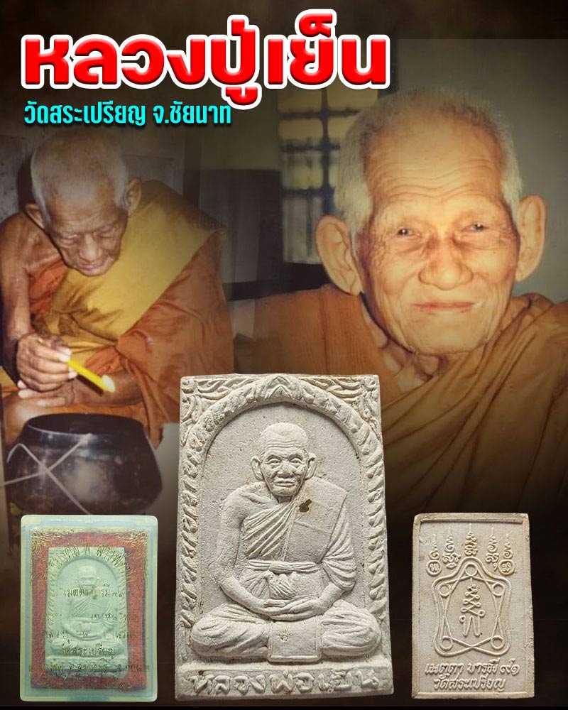 | พระผงรูปเหมือน หลวงปู่เย็น ทานรโต วัดสระเปรียญ เมตตาบารมี 91 ฝังเพชรหน้าทั่ง สวยเดิม ขึ้นชื่อที่สุดคือ “พ.พาน” ของท่านเป็นของมีชีวิต ยามจะเกิดภัยจะสามารถส่งเสียงร้องเตือนได้และยังเป็นของทางคุ้มครองแคล้วคลาด เมตตามหานิยม วิชา “พ.พาน” จากหลวงปู่โลกอุดรที่ถ่ายทอดให้ท่านนั้นเป็นวัตถุมงคลแก้วสารพัด นึก แต่ทั้งนี้ผู้ครอบครองต้องรู้จักคำว่าพอเมื่อถึงความพอแล้วแก้วสารพัดนึกจะปรากฏขึ้นมาเอง “หลวงปู่เย็น ทานรโต” ท่านมรณภาพด้วยอาการสงบ ในวันอาทิตย์ที่ ๑๒ พฤกษภาคม ๒๕๓๙ เวลา ๑๓.๔๕ น. รวมอายุได้ ๙๔ปี ๒เดือน ๑๑ วัน สรีระของท่านหลังจากสวดอภิธรรม บำเพ็ญกุศลแล้วนำมาบรรจุใส่โลงแก้วประดิษฐานไว้ที่วัดสระเปรียญ เพื่อให้สาธุชามาสักการะขอพรกันอย่างสม่ำเสมอ คาถา ตัว พ.พานมหัศจรรย์ ตำรับหลวงปู่โลกอุดร พ่อจงมาโปรดลูกคนนี้ให้เขากินอิ่มนอนหลับ พ่อจงมาโปรดลูกคนนี้เขาจะเอาอะไรก็ขอให้ช่วยเขาสมปรารถนา พระเจ้าพ่อจงมาโปรดลูกคนนี้ พุทธะเตเชนะ ความใดอย่าให้ถูก ปติเสวามิ พุทธะเมตตาจิต ธัมมะเมตตาจิต สังฆะเมตตาจิต นะเมตตา โมกรุณา พุทปราณี ธายินดี ยะเอ็นดู อิสวาสุ สุสวาอิ พุทธะปิติอิ |