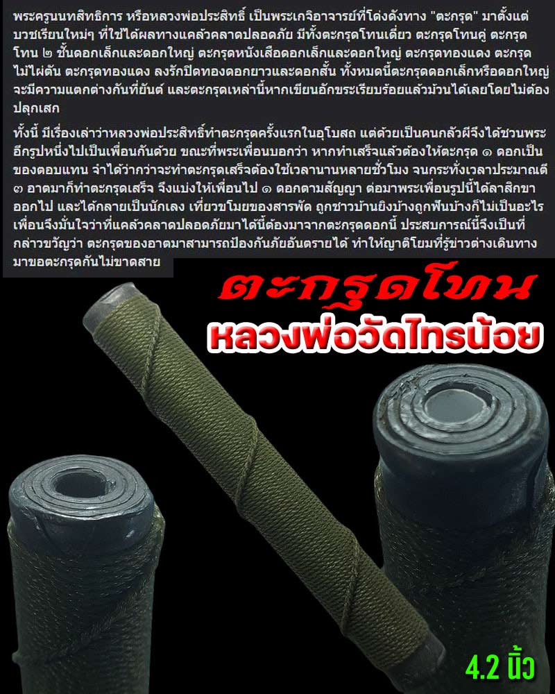 | ตะกรุดโทน หลวงพ่อวัดไทรน้อย ขนาด 4.2 นิ้ว สวยเดิม หนัก ๆ เน้น ๆ ราคาพิเศษ เปิดราคา อีกครั้ง ครับ พระครูนนทสิทธิการ หรือหลวงพ่อประสิทธิ์ เป็นพระเกจิอาจารย์ที่โด่งดังทาง "ตะกรุด" มาตั้งแต่บวชเรียนใหม่ๆ ที่ใช้ได้ผลทางแคล้วคลาดปลอดภัย มีทั้งตะกรุดโทนเดี่ยว ตะกรุดโทนคู่ ตะกรุดโทน ๒ ชั้นดอกเล็กและดอกใหญ่ ตะกรุดหนังเสือดอกเล็กและดอกใหญ่ ตะกรุดทองแดง ตะกรุดไม้ไผ่ตัน ตะกรุดทองแดง ลงรักปิดทองดอกยาวและดอกสั้น ทั้งหมดนี้ตะกรุดดอกเล็กหรือดอกใหญ่จะมีความแตกต่างกันที่ยันต์ และตะกรุดเหล่านี้หากเขียนอักขระเรียบร้อยแล้วม้วนได้เลยโดยไม่ต้องปลุกเสก ทั้งนี้ มีเรื่องเล่าว่าหลวงพ่อประสิทธิ์ทำตะกรุดครั้งแรกในอุโบสถ แต่ด้วยเป็นคนกลัวผีจึงได้ชวนพระอีกรูปหนึ่งไปเป็นเพื่อนกันด้วย ขณะที่พระเพื่อนบอกว่า หากทำเสร็จแล้วต้องให้ตะกรุด ๑ ดอกเป็นของตอบแทน จำได้ว่ากว่าจะทำตะกรุดเสร็จต้องใช้เวลานานหลายชั่วโมง จนกระทั่งเวลาประมาณตี ๓ อาตมาก็ทำตะกรุดเสร็จ จึงแบ่งให้เพื่อนไป ๑ ดอกตามสัญญา ต่อมาพระเพื่อนรูปนี้ได้ลาสิกขาออกไป และได้กลายเป็นนักเลง เที่ยวขโมยของสารพัด ถูกชาวบ้านยิงบ้างถูกฟันบ้างก็ไม่เป็นอะไร เพื่อนจึงมั่นใจว่าที่แคล้วคลาดปลอดภัยมาได้นี้ต้องมาจากตะกรุดดอกนี้ ประสบการณ์นี้จึงเป็นที่กล่าวขวัญว่า ตะกรุดของอาตมาสามารถป้องกันภัยอันตรายได้ ทำให้ญาติโยมที่รู้ข่าวต่างเดินทางมาขอตะกรุดกันไม่ขาดสาย |