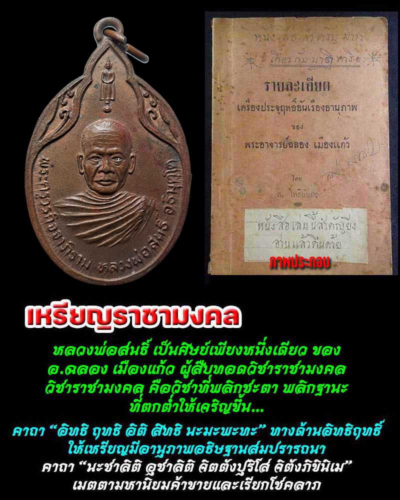| เหรียญราชามงคล หลวงพ่อสนธิ์ วัดไทรย์นิโครธาราม จ.อ่างทอง เครดิต ศิษย์สายวัดสะพานสูง 30 พฤษภาคม 2017 · ตำนานตะกรุดราชามงคล อ.ฉลอง เมืองแก้ว ในวงการพระเครื่องและไสยศาสตร์ ล้วนทราบว่า มีอาจารย์เพียงสองท่าน ที่สามารถนำวัตถุมงคลไปทิ้งทะเล และเรียกกลับมาได้ อาจารย์ทั้งสองท่านล้วนเป็นฆราวาสทั้งคู่ อาจารย์ทั้งสองท่าน คือ อ.ชุม ไชยคีรี และ อ.ฉลอง เมืองแก้ว เรื่องของอ.ชุม มีคนนำมาลงมากมาย แต่เรื่องอ.ฉลอง เมืองแก้ว ไม่ค่อยมีใครนำมาลง แอดมินจึงขอนำเรือ่ง พิธีกรรมการเสกตะกรุดราชามงคล ของอ.ฉลอง เรื่องนี้เป็นเรื่องที่ถอดจากปาฐกถา อ.เสถียร โพธินันทะ ที่ท่านเคยบรรยายไว้ครั้งหนึ่ง เนื่องจากอ.เสถียร เป็นลูกศิษย์อ.ฉลอง เมืองแก้ว ท่านจึงอยู่ในเหตุการณ์ การปลุกเสกทั้งสามครั้ง เมื่อปีสงครามอินโดจีน อ.ฉลอง เมืองแก้ว อยากจะรังสรรค์สร้างตะกรุดฝากไว้ในแผ่นดิน ท่านจึงทำตะกรุดราชามงคล เนื้อทองคำ จำนวน๑๒๐ดอก และตะกรุดนี้ มีพิธีปลุกเสกค่อนข้างพิศดาร ต้องไปปลุกเสกที่ทะเล ที่ป้าช้าผีดิบ ที่ยอดประสาทดังมีรายละเอียดดังนี้ สถานที่ที่อ.ฉลอง ไปปลุกเสกที่ทะเล คือเกาะลอยศรีราชา ท่านให้ลูกศิษย์ท่าน ที่เป็นราชกาลใหญ่ เป็นคนนั่งเรือ ไปโปรยตะกรุดที่ทะเล และจัดพิธีราชวัตรฉัตรธง ที่ชายฝั่ง เมื่อเริ่มพิธีเรียกตะกรุด ฟ้าที่สงบนิ่งกลับแปรปรวน มีทั้งลมมีทั้งฝน คลื่นซัดชายหาดดังตึงๆ พออ.ฉลองทำพิธีอยู่สองสามชั่วโมง มีตะกรุดวิ่งมาตามคลื่น วิ่งเลยขึ้นมาถึงชายฝั่ง ตะกรุดทะยอยทีหนึ่ง สองดอกสามดอก จนไม่มีตะกรุดเข้ามาแล้ว อ.ฉลอง จึงให้ลูกศิษย์ตรวจนับดู มีอยู่เพียง๑๑๙ดอก หายไปดอกหนึ่ง อ.ฉลองกำหนดจิตดู ก็ทราบว่าอีกดอกหนึ่ง ถูกเด็กที่อยู่แถวนั้นขโมยไป พิธีที่สองทำที่ป่าช้าวัดดอนยานนาวา ตอนที่ทำพิธี มีตำรวจเข้ามาสอบถามว่าเข้ามาทำอะไรกัน เพราะมีคนแจ้งว่า มีคนเป็นร้อยเข้าไปที่บริเวณป่าช้า ทางคณะลูกศิษย์จึงบอกตำรวจว่า มาทำพิธีปลุกเสกของ ตำรวจเลยขออยู่ดูด้วย อ.ฉลอง ได้ให้ลูกศิษย์โปรยตะกรุดไปรอบบริเวณป่าช้า โปรยไปโดยไม่ต้องกำหนดทิศทาง เรียกว่าโปรยซี้ซั้วเลย เมื่ออ.ฉลองทำพิธีเรียก ตะกรุดได้ลอยมาทางอากาศ โดนหัวโดนตัวผู้ที่จะเป็นเจ้าของ เพราะมีชื่อเขียนไว้ที่หัวตะกรุด พิธีที่สาม เสกที่ยอดประสาทวัดราชนัดดา เมื่อบวงสรวงกันเรียบร้อย ถึงฤกษ์ปลุกเสก อ.ฉลองเดินนำลูกศิษย์ขึ้นไปสี่ห้าคน พอไปถึงยอดปราสาท ปรากฏว่าประตูลูกกรงล็อค อ.ฉลองเลยถามว่ากุญแจอยู่กับใคร ทำเอาป่วนเลย เพราะกุญแจอยู่กับเณร และเณรก็กลับไปกุฏิแล้ว ลูกศิษย์เลยทำท่
