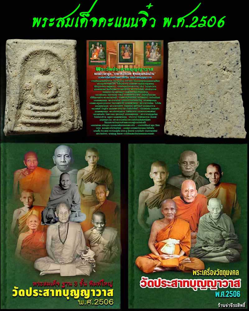 | พระสมเด็จคะแนนจิ๋ว วัดประสาทบุญญาวาส ปี 2506 พระคะแนนจิ๋ว ค่อนข้างหายากครับ โดยเฉพาะ เนื้อโซน อมเขียว...ถึงว่า สุด ๆ ในสายเหมือนกัน ผมเก็บสะสมไว้นานมาก ถ่ายรูป ยาก ไม่คิดจะนำมาออก วันนี้ ลองถ่ายรูปดู....อาจะไม่ค่อยชัด พระเล็กมากครับ ราคาพิเศษครับ รวม สุดยอดแห่ง มวลสาร พระสมเด็จ รวม สุด ยอด พระเกจิ ชื่อดัง แห่ง ยุค 108 คณาจารย์ ร่วมพิธีปลุกเสก จนล้นโบสถ์ 3 วัน 3 คืน *** มวลสาระสำคัญที่ได้รับมอเพื่อการจัดสร้างพระมีดังนี้ *** .มวลสารในการจัดสร้างสุดยอด มีส่วนผสม - ผงสมเด็จบางขุนพรหม พระครูบริหารคณาวัตร รองเจ้าอาวาสมอบให้ - ผงพระหักสมเด็จพระพุฒาจารย์โต - ผงพระหักสมเด็จปิลันท์ ซึ่งพบในเจดีย์วัดเทพากร - ผงพระเครื่องของขวัญวัดปากน้ำ ลพ.สดมอบให้วัดประสาทเมื่อปี พ.ศ. ๒๔๙๗ - ผงพระหักกรุลำพูน - ผงพระกรุวัดพลับ - ผงหลวงพ่อโอภาสี เป็นต้น ... ... รายนามพระเกจิอาจารย์ที่มาร่วมพิธีปลุกเสกอาทิ เช่น - พระอาจารย์ทิม วัดช้างให้ จ.ปัตตานี - หลวงพ่อเนื่อง วัดจุฬามณี จ.สมุทรสงคราม - หลวงพ่อพรหม วัดบิง จ.โคราช - หลวงพ่อพรหม วัดช่องแค จ.นครสวรรค์ - หลวงปู่เพิ่ม วัดกลางบางแก้ว จ.นครปฐม - หลวงพ่อผล วัดเทียนดัด - หลวงปู่เหรียญ วัดบางระหงส์ จ.นนทบุรี - หลวงพ่อทองอยู่ วัดท่าเสา จ.สมุทรสาคร - หลวงพ่อเหมือน วัดกำแพง จ.ชลบุรี - หลวงพ่อนิล วัดครบุรี จ.โคราช - พ่อท่านคล้าย วัดสวนขัน จ.นครศรีธรรมราช - หลวงพ่อโอน วัดโคกเดื่อ จ.นครสวรรค์ - หลวงพ่อน้อย วัดหนองโพ จ.นครสวรรค์ - หลวงพ่อบุญมี วัดเขาสมอคอน จ.ลพบุรี - หลวงปู่ทิม วัดระหารไร่ จ.ระยอง - หลวงปู่เขียว วัดหรงบน จ.นครศรีธรรมราช - หลวงพ่อดิษฐ์ วัดปากสระ จ.พัทลุง - หลวงพ่อแดง วัดเขาบันไดอิฐ จ.เพชรบุรี - อาจารย์นำ วัดดอนศาลา จ.พัทลุง - พ่อท่านแดง วัดศรีมหาโพธิ์ จ.ปัตตานี - หลวงพ่อกัน วัดเขาแก้ว จ.นครสวรรค์ - หลวงพ่อโด่ วัดนามะตูม จ.ชลบุรี - หลวงปู่เฮี้ยง วัดป่า จ.ชลบุรี - หลวงพ่อมิ่ง วัดกก บางขุนเทียน จ.กรุงเทพ - หลวงพ่ออินทร์ วัดโบสถ์ จ.ราชบุรี - อาจารย์ไสว วัดราชนัดดา จ.กรุงเทพ - หลวงพ่อทองสุข วัดสะพานสูง จ.นนทบุรี - หลวงพ่อแดง วัดทุ่งคอก จ.สุพรรณบุรี - หลวงพ่อยิ้ม วัดเจ้าเจ็ด จ.อยุธยา - หลวงพ่อแจ่ม วัดวังแดงเหนือ จ.อยุธยา - หลวงพ่อโบ้ย วัดมะนาว จ.สุพรรณบุรี - หลวงพ่อน้อย วัดธรรมศาลา จ.นครปฐม - หลวงปู่โต๊ะ วัดประดู่ฉิมพลี ท่าพระ จ.กรุงเทพ - หลวงปู่นาค วัดระฆัง จ.กรุงเทพ - หลวงพ่อเงิน วัดดอนยายหอม จ.นครปฐม - หลวงพ่อกวย วัดโฆสิตาราม จ.ชัยนาท - หลวงปู่ดู่ วัดสะแก จ.อยุธยา - หลวงปู่สี วัดสะแก จ.อยุธยา - หลวงพ่อกี๋ วัดหูช้าง จ.นนทบุรี - หลวงพ่อเส่ง วัดกัลยาณมิตร จ.กรุงเทพ - หลวงพ่อฑู