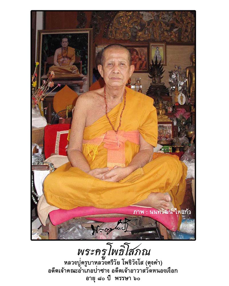 ล็อเก็ตฉากทอง หลวงปู่สอ พันธุโล วัดป่าหนองแสง หลังหลวงพ่อเจ็ดกษัตริย์ ที่ระลึกอายุ 85 ปี พ.ศ.2549 หนึง ในพระอริยเจ้า สายวิปัสนา หลวงพ่อเจ็ดษัตริย์องค์จริง เป็นพระพุทธรูปคู่บารมีของหลวงปู่สอ พันธุโล วัดบ้านหนองแสง ตำบลสิงห์ อำเภอเมือง จังหวัดยโสธร เป็นพระพุทธรูปเก่าแก่อายุประมาณ ๘๐๐ ปี ขนาดหน้าตัก ๙ นิ้ว หลวงปู่สอ ท่านได้มาเมื่อประมาณ พ.ศ.๒๕๐๘ ในช่วงที่ท่านจำพรรษาอยู่วัดป่าอรัญญิกาวาส อำเภอบ้านผือ จังหวัดอุดรธานี ก่อนหน้าที่จะได้รับพระพุทธรูปมา ประมาณพรรษาที่ ๒-๖ เวลาหลวงปู่สอนั่งสมาธิภาวนามักจะได้นิมิตเห็นงูใหญ่สีทองเท่าต้นเสามาหาที่ กุฏิ บางครั้งมาขนดตัวให้ท่านนั่งคล้ายพระนาคปรก มีอยู่ครั้งหนึ่งท่านกำลังเดินรอบวัด ได้ยินเสียงดังขึ้นในอากาศว่า "สัญลักษณ์ของท่านอาจารย์นั้น จะตกทอดมาจากอากาศ บางทีอาจจะมีคนเก็บรักษาไว้ แล้วนำมาถวาย" หลวงปู่สอท่านเฝ้าสังเกตดูมาตลอดว่า อะไรที่ท่านจะได้รับตามนิมิตนั้น จนกระทั่งพรรษาที่ ๘ จึงมีสองสามีภรรยา ชื่อนายกำพล คนในอำเภอบ้านผือได้นำมาถวายในตอนเช้า ประมาณ ๙ นาฬิกา และหลวงปู่สอก็นำไปถวายให้หลวงตามหาบัวดูในตอนสายวันนั้น ซึ่งหลวงตามหาบัวบอกว่า "พระนี้เป็นของดีจริงๆ รักษาไว้ให้ดีนะ" หลังจากข่าวนี้แพร่ออกไปในหมู่พระเถระในสมัยนั้น ก็มีครูบาอาจารย์หลายรูปได้ชมและกราบไหว้ เช่น หลวงปู่ฝั้น อาจาโร และ หลวงปู่ขาว อนาลโย เป็นต้น พระพุทธรูปองค์นี้สามารถสื่อสารกับหลวงปู่สอได้ ซึ่งเป็นเรื่องเฉพาะตัวของท่าน ถ้าหลวงปู่ท่านอยากทราบอะไร หรือจะมีเหตุอะไรเกิดขึ้น ท่านก็มักจะกำหนดจิตกราบทูลถามเสมอ บางครั้งญาติโยมที่ไปกราบไหว้ ท่านก็ให้อธิษฐานยกพระพุทธรูปก็มีหลายคน เมื่อปีพ.ศ.๒๕๔๐ พระครูสิทธิวราคม (นิคม) ได้มีโอกาสไปกราบหลวงปู่สอ และประจักรในพุทธคุณของหลวงพ่อเจ็ดกษัตริย์ จึงขออนุญาตสร้างองค์จำลองไว้ ณ วัดเวฬุวัน แต่เนื่องจากใช้ทุนทรัพย์มาก จึงนิมนต์หลวงปู่สอ ไปที่บ้านเรือนไทยของคุณหญิง สุรีพันธ์ มณีวัต และได้ปรึกษาหารือท่านพระอาจารย์อุทัย (ติ๊ก) ฌานุตตโม เห็นสมควรร่วมกันสร้างขึ้น ประกอบกับในช่วง ปี ๒๕๔๐-๒๕๔๑ เป็นปีที่ประเทศไทยประสพภาวะวิกฤตเศรษฐกิจและภาวะภัยแล้งอย่างหนัก หลวงปู่สอ จึงปรารภกับคณะศิษย์ว่า "ถ้าสร้างหลวงพ่อเจ็ดกษัตริย์ จำลอง ครบ ๗ แห่ง จะช่วยให้สถานการณ์ต่างๆดีขึ้น" ดังนั้น จึงเกิดโครงการสร้างหลวงพ่อเจ้ดกษัตริย์ จำลองขึ้นซึ่งใช้ทุนทรัพย์กว่า ๒๐ ล้านบาท นอกจากนั้นในปี ๒๕๔๓ จึงได้มีการสร้างน้อมเกล้าฯถวายพระบาทสมเด็จพระเจ้าอยู่หัวฯ แ