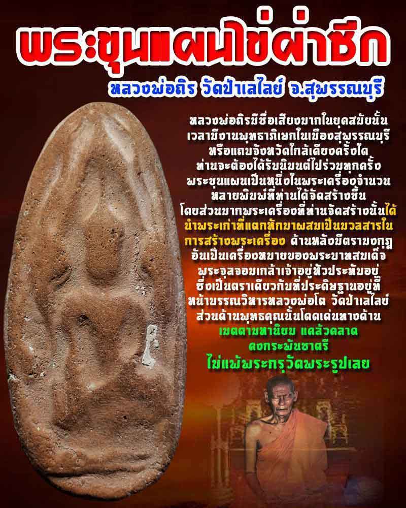 | พระขุนแผนไข่ผ่าซีก หลวงพ่อถิร วัดป่าเลไลย์ (1) ขนาดกลาง ๆ ครับ องค์นี้ พระขุนแผน เนื้อดิน ใต้ฐานมีฝังเข็มของเครื่องเล่นแผ่นเสียง สร้างโดยหลวงพ่อถิร แห่งวัดป่าเลไลย์ สุพรรณบุรี หลวงพ่อถิรมีชื่อเสียงมากในยุคสมัยนั้น เวลามีงานพุทธาภิเษกในเมืองสุพรรณบุรี หรือแถบจังหวัดใกล้เคียงครั้งใด ท่านจะต้องได้รับนิมนต์ไปร่วมทุกครั้ง พระขุนแผนเป็นหนึ่งในพระเครื่องจำนวนหลายพิมพ์ที่ท่านได้จัดสร้างขึ้น โดยส่วนมากพระเครื่องที่ท่านจัดสร้างนั้นได้นำพระเก่าที่แตกหักมาผสมเป็นมวลสารในการสร้างพระเครื่อง ด้านหลังมีตรามงกุฎ อันเป็นเครื่องหมายของพระบาทสมเด็จพระจุลจอมเกล้าเจ้าอยู่หัวประทับอยู่ ซึ่งเป็นตราเดียวกับที่ประดิษฐานอยู่ที่ หน้าบรรณวิหารหลวงพ่อโต วัดป่าเลไลย์ ส่วนด้านพุทธคุณนั้นโดดเด่นทางด้าน เมตตามหานิยม แคล้วคลาด คงกระพันชาตรี ไม่แพ้พระกรุวัดพระรูปเลย |