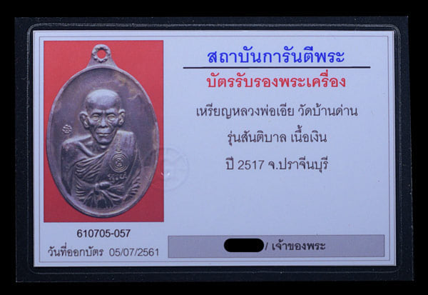 | ชื่อพระเครื่อง | เหรียญหลวงพ่อเอีย วัดบ้านด่าน รุ่นสันติบาล เนื้อเงิน |