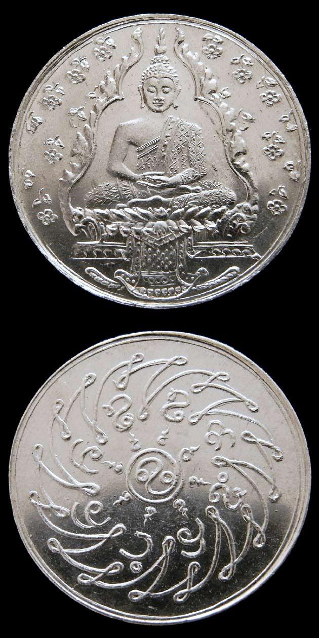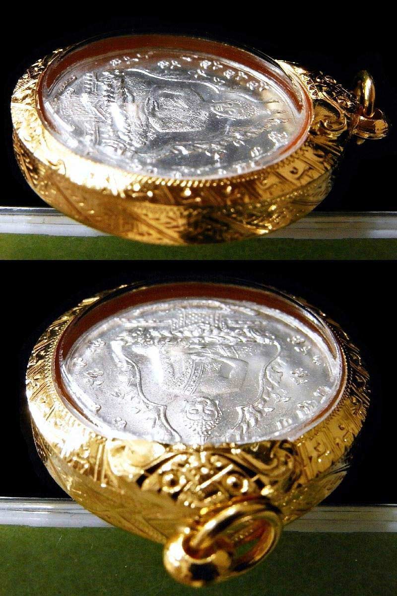 | เหรียญพระแก้วมรกต ฉลองกรุงรัตนโกสินทร์ 150 ปี เนื้อเงิน (พบเจอน้อยมาก) เลี่ยมทองสั่งทำยกซุ้มอย่างสวยจากร้านดังย่านเยาวราช สภาพสวยคมสมบูรณ์ทั้งด้านหน้า และด้านหลัง ทุกรายละเอียดยังคงคมชัด พิธียิ่งใหญ่จริงๆครับ แค่ชมรายนามเกจิอาจารย์ที่เข้าร่วมพิธีปลุกเสกก็ขนลุกแล้วครับ เนื้อเงินนี่พบเจอน้อยมากจริงๆ ยิ่งสภาพสวยสมบูรณ์หมดจรดแบบนี้แทบไม่ต้องไปเสาะหา มีขนาดเส้นผ่าศูนย์กลาง 2.5 ซ.ม. และ 3.1 ซ.ม. เมื่อวัดรวมกรอบทองที่เลี่ยมแล้ว มาพร้อมบัตรรับรองพระเครื่องที่แม้แต่คณะผู้ตรวจสอบยังต้องระบุว่า "สภาพสวย" เพื่อยืนยันความแท้ และไม่มีหักซ่อมใดๆ ตามมาตรฐานของร้าน นิว พระเครื่อง คือนอกจะแท้แล้ว ยังต้องสวยสมบูรณ์หมดจรดอีกด้วย ท่ามกลางพระเก๊เกลื่อนสนามที่ระบาดอยู่ทั่วไปในเวลานี้ครับ เหรียญพระพุทธมหามณีรัตนปฏิมากรแก้วมรกต ปี พ.ศ.2475 ซึ่งเป็นเหรียญที่สร้างในคราวฉลองกรุงเทพมหานครครบ 150 ปี ใน ปี พ.ศ.2470 พระบาทสมเด็จพระปกเกล้าเจ้าอยู่หัว รัชกาลที่ 7 ทรงแต่งตั้งคณะกรรมการเพื่อปฏิสังขรณ์วัดพระศรีรัตนศาสดาราม ให้ทันกับการสมโภชกรุงเทพมหานคร ซึ่งจะมีอายุครบ 150 ปี ใน พ.ศ.2475 โดยทรงโปรดเกล้าฯ ตั้งสมเด็จพระบรมวงศ์เธอเจ้าฟ้าบริพัตรสุขุมพันธ์ กรมพระนครสวรรค์วรพินิต ทรงเป็นประธานกรรมการ คณะกรรมการประมาณเงิน ที่จะต้องใช้ในการปฏิสังขรณ์ไว้ 600,000 บาท พระบาทสมเด็จพระปกเกล้าเจ้าอยู่หัว มีพระราชศรัทธา อุทิศพระราชทรัพย์ส่วนพระองค์ 200,000 บาท เป็นทุนในการปฏิสังขรณ์ วัดพระศรีรัตนศาสดาราม คณะรัฐบาลอนุมัติเงินแผ่นดินสมทบทุนในการปฏิสังขรณ์อีก 200,000 บาท สำหรับส่วนที่ยังขาดอยู่ทรงพระกรุณาโปรดเกล้าฯ ที่จะให้พระบรมวงศานุวงศ์ ข้าราชการ และประชาชนทั่วไปได้มีโอกาสที่จะบำเพ็ญกุศลร่วมกัน ดังนั้น คณะกรรมการปฏิสังขรณ์ จึงได้ดำเนินการเรี่ยไร โดยมีกระทรวงพระคลังมหาสมบัติจัดพนักงานเรี่ยไร โดยมีการโฆษณาประกาศบอกบุญตามใบปลิวที่โรงพิมพ์บำรุงนุกูลกิจพิมพ์ถวาย เมื่อปี พ.ศ.2473 อนึ่งผู้ที่มีจิตศรัทธาบริจาคปัจจัยร่วมปฏิสังขรณ์วัดพระศรีรัตนศาสดาราม จะได้รับใบเสร็จเป็นหลักฐานพร้อมเหรียญพระพุทธมหามณีรัตนปฏิมากร ด้านหน้าเหรียญ ภายในซุ้มเรือนแก้วเป็นรูป พระแก้วมรกต ประทับนั่งบนฐานบัวคว่ำบัวหงาย มีผ้าทิพย์ห้อย และดอกไม้อยู่โดยรอบ ด้านหลังเหรียญ เป็นรูปยันต์กงจักร มีอักษรจารึก มรรค 8 อักขระขอมที่ปรากฏ คือ ทิ คือ สัมมาทิฐิ สํ คือ สัมมาสังกัปโป วา คือ สัมมาวาจา กํ คือ สัมมากัมมันโต อา คือ สัม อาชิโว วา คือ สัมมา วายาโม ส คือ สัมมา สติ สํ คือ สัมมาสมาธิ ร