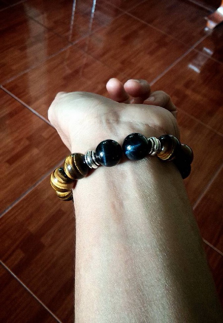 | ใช้เป็นเครื่องรางมาแต่โบราณกาล หลอมรวมพลังจักรวาลมานับพันปี หินแท้มีพลัง ดิน น้ำ ลม ไฟ ทุกเม็ด สร้อยข้อมือหิน ไทเกอร์อาย คั่นด้วย บลูไทเกอร์อาย สวยงาม เสริมมงคล เข้มขลัง มีพลังดึงดูด...( นะมะพะทะ นิมิพิทิ นุมุพุทุ )หินเลือกผู้ครอบครองเสมอ! -ไทเกอร์อายส์ Tiger Eyes "ไทเกอร์อาย" เป็นหินสีเหลืองทอง หรือสีนํ้าตาลทองอยุ่ในตระกูลคว้อทซ์ ความแข็งอยู่ประมาณ 6.5-7ตามสเกลของโมห์ เป็นหินที่เกิดจากการก่อตัวมาจากหินฮอคส์อาย เมื่อมีหินคว้อทซ์แทรกตัวแทนที่แร่โครซิโดไลท์ และเมื่อนําไปขัดสีฉวีวรรณแล้วจะมีลักษณะสะท้อนแสงตามแนวขวางเหมือนตาของเหยี่ยวจึงได้ชื่อว่า ฮอคส์อาย ต่อมามีแร่เหล็กแทรกตัวเข้าไปในฮอคส์อายอีกจะเกิดอ็อกไซด์สีนํ้าตาลเป็นแนวยาว จึงเรียกว่าไทเกอร์ส์อายเพราะจะมีสีเหลืองทองปนนํ้าตาลมากขึ้นคล้ายกับสีของเสือโคร่ง หรือสัตว์จําพวกแมวใหญ่ ยกเว้นสิงห์โต และจะมีการเล่นแสงแพรวพราวเหมือนไหม หรือผ้าซาตินลักษณะนี้เรียกว่าแชทโทยันซี(chatoyancy-เป็นแสงเส้นยาวตามวิ่งเหลือบไปมาบนผิวหน้าของอัญมณี)เมื่อเจียรไนเป็นรูปหลังเบี้ย(หลังเบี้ยคือการเจียรนัยเป็นรูปครึ่งวงกลม นูน)พบมากที่อินเดีย อเมริกา เม็กซิโกพม่า อินเดีย นามิเบีย ออสเตรเลีย อาฟริกาไต้ ...มีสีเหลืองทอง เหลืองทองอมนํ้าตาลทึบแสง เนื่องจากมีลักษณะทางกายภาพเหมือนเป็นไฟเบอร์เล็กๆแทรกอยู่ภายในคริสตัลของแร่ซิลิกา จึงทําให้เกิดลักษณะเช่นนี้ขึ้น เป็นหินชนิดหนึ่งที่สามารถดึงดูดโชคลาภความมั่งคั่งรํ่่ารวย และยังจะรักษาความรํ่ารวยไว้ได้ ป้องกันอันตราย ทําให้จิตใจที่มีความทิฐิ ดื้อดึง ให้อ่อนโยนลง ช่วยให้พลังหญิงชายสมดุลย์กัน ทําให้ปัญหาเรื่องเพศหมดไป จิตใจผ่อนคลายจิตใจไม่สับสน ชีวิตไม่วุ่นวายเป็นระเบียบ และเปิดใจยอมรับ เป็นหินที่ให้ความคุ้มครองและป้องกันตัวสูงมากชนิดหนึ่ง ป้องกันการถูกสาบแช่งและจิตใจมุ่งร้ายที่จะทําให้เกิดการเจ็บป่วย ป้องกันจิตใจในภาวะที่ไม่รู้สึกตัว หรือกําลังนอนหลับและในภาวะที่กําลังฝันอยู่ ถ้าพกหินชนิดนี้ไว้กับตัวจะทําให้มีเสน่ห์ต่อเพศตรงข้าม มีพลังในด้านของเสน่ห์ติดตัว ช่วยในการปกป้องคุ้มครองอันยอดเยี่ยมเปรียบเสมือนมีเกราะป้องกันตัวสามารถป้องกันพลังด้านลบ รวมไปถึงการทำทางไสยศาสตร์ต่างๆใครทำของไม่ดีใส่จะกลับไปหาคนนั้น และยังช่วยในเรื่องของอารมณ์ ความเบื่อหน่ายขี้เกรียจให้มีไฟอยู่ตลอดเวลา จะทำให้เกิดความอดทน มั่นใจในตัวเองไม่ย่อท้อในเรืองของกายภาพ จะช่วยในระบบการย่อยอาหารได้ดี ...ไทเกอร์อายเหมาะกับ