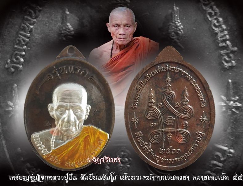 | เหรียญรุ่นแรก หลวงปู่ปัน สัมปันนธัมโม ต้องรุ่นนี้เลยครับนำไปหลอมเพื่อทำมวลสาร แต่ไม่ละลาย เนื้อนวะหน้ากากเงินลงยาจีวรเหลือง หมายเลขเบิ้ล ๕๕ สร้าง๑๙๙ เหรียญ กล่องเดิม หลวงปู่ปัน สัมปันนธัมโม วัดเทพนิมิตจันทร์แสงวนาราม บ้านขามป้อม ต.สวนหม่อน อ.มัญจาคีรี จ.ขอนแก่น ขณะใช้ชีวิตฆราวาสมีโอกาสรับใช้อุปัฏฐาก “หลวงปู่ผาง จิตตคุตโต” วัดอุดมคงคาคีรีเขต อ.มัญจาคีรี จ.ขอนแก่น ฝากตัวเป็นศิษย์ ศึกษาวิทยาคมกับหลวงปู่ผาง เจตนาจัดสร้างเพื่อหาจตุปัจจัยสมทบทุนสร้างกฏิและพัฒนาสาธารณูปโภคภายในวัด ลักษณะเป็นเหรียญรูปไข่ ไม่เจาะหู ด้านหน้าเหรียญ ยกขอบ บนสุดเขียนว่า รุ่นแรก บริเวณกลางเหรียญ เป็นรูปเหมือนครึ่งองค์หลวงปู่ปันห่มจีวรเฉียง ล่างสุดเขียนว่า “หลวงปู่ปัน สมฺปนฺนธมฺโม” ด้านหลังเหรียญ จากด้านขวาของเหรียญวนขึ้นไปด้านบนวนทางด้านซ้าย เขียนว่า “วัดเทพนิมิตจันทร์แสงวนาราม จ.ขอนแก่น” บริเวณกลางเหรียญเป็นอักขระยันต์ และตัวเลข “๒๕๖๑” เป็นปีพุทธศักราชที่จัดสร้าง ล่างสุดมีตัวอักษรเขียนว่า “ศิษย์สร้างบูชาพระคุณหลวงปู่” |