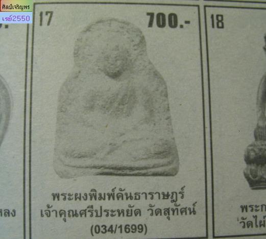 | **รหัส ศ.ร.๑๐๔๑๓ พระผงคันธราช เจ้าคุณศรีประหยัด วัดสุทัศน์ ปี ๒๔๙๖ ผสมผงตะไบพระกริ่งวัดสุทํศน์ ปี 2496 พระดีพิธีใหญ่ หายากแล้วครับ (***ภาพประกอบจากหนังสือเก่าครับ) พระสมเด็จเจ้าคุณศรีประหยัด วัดสุทัศน์ ปี ๒๔๙๖ ผสมผงตะไบพระกริ่ง วัดสุทํศน์ จัดสร้างในปี พ.ศ.2496 ทางวัดสุทัศน์ ได้มีพิธีสร้างพระครั้งใหญ่ขึ้น โดยพระครูใบฎีกา ประหยัด ปัญญาธโร(สมณศักดิ์ในขณะนั้น) เจ้าคณะ2 เป็นประธานจัดสร้าง ได้จัดสร้างพระพิมพ์ขึ้นมาหลายพิมพ์เป็นพระเนื้อผงสีขาว(บางองค์อมเขียว) แบบเดียวกับพระของท่านพระครูมูล ซึ่งค่อนข้างหาชมได้ยากแล้ว พระผงในพิธีปี 2496 นี้มีส่วนผสมของผงพระสมเด็จจากวัดระฆัง, ผงเก่าที่คณาจารย์ปลุกเสกไว้ที่วัดสุทัศน์ และตะไบชนวนพระกริ่งวัดสุทัศน์รุ่นเก่าที่สมเด็จพระสังฆราช(แพ) สร้างไว้ พิธีใหญ่ปลุกเสกหมู่ 3 วาระ ระหว่างเดือนมกราคม 2496 จนถึงกุมภาพันธ์ในปี 2497 เกจิฯรวม 96 รูป อาทิเช่น สมเด็จพระพุทธโฆษาจารย์ อยู่ วัดสระเกศ, สมเด็จพระพุฒาจารย์ นวม วัดอนงคาราม, พระญาณโพธิ วัดสุทัศน์, หลวงพ่อสิงห์คำ วัดเชียงราย, หลวงปู่ใจ วัดเสด็จ, หลวงปู่เหรียญ วัดเทวะสังฆาราม กาญจนบุรี, หลวงพ่อลา วัดแก่งคอย สระบุรี, หลวงพ่ออั้น วัดพระญาติ อยุธยา, หลวงพ่อช่วง วัดบางแพรกใต้ นนทบุรี, หลวงพ่อผล วัดหนัง, หลวงพ่อรุ่ง วัดท่ากระบือ สมุทรสาคร, หลวงพ่อเงิน วัดดอนยายหอม, หลวงพ่อถิร วัดป่าเลไลยก์ สุพรรณฯ, หลวงปู่เฮี้ยง วัดป่า ชลบุรี, หลวงปู่เผือก วัดกิ่งแก้ว สมุทรปราการ, หลวงพ่อพักตร์ วัดบึงทองหลาง, หลวงพ่อกึ๋น วัดดอน ยานนาวา, หลวงพ่อฑูรย์ วัดโพธินิมิตร, หลวงพ่อนอ วัดกลาง อยุธยา, หลวงพ่อเล็ก วัดบางนมโค อยุธยา, หลวงพ่อฮะ วัดดอนไก่ดี สมุทรสาคร, หลวงพ่อเล็ก วัดท่าลาด ฉะเชิงเทรา, หลวงพ่อจาด วัดบางกระเบา ปราจีนบุรี, หลวงพ่อห้อง วัดช่องลม ราชบุรี, หลวงพ่อเล็ก วัดบางนมโค อยุธยา, หลวงพ่อแฉ่ง วัดคงคาราม เพชรบุรี, หลวงพ่อแฉ่ง วัดบางพัง นนทบุรี, พระอาจารย์สา วัดราชนัดดา, หลวงพ่อหอม วัดชากหมาก ชลบุรี, หลวงพ่อจง วัดหน้าต่างนอก อยุธยา, หลวงพ่อเส่ง วัดกัลยาฯ, หลวงพ่อสุข วัดโตนดหลวง เพชรบุรี, หลวงพ่อแต้ม วัดพระลอย สุพรรณบุรี, หลวงพ่ออี๋ วัดสัตหีบ ฯลฯ ในระหว่างพิธีพุทธาภิเษกนั้นเอง พระเกจิฯทั้งหลายก็ได้เห็นนิมิตแสงสีต่างๆอันเป็นนิมิตมงคลซึ่งรวมไปถึงเห็นสมเด็จพระสังฆราช(แพ) มาร่วมในพิธีครั้งนั้นด้วยฯลฯ |