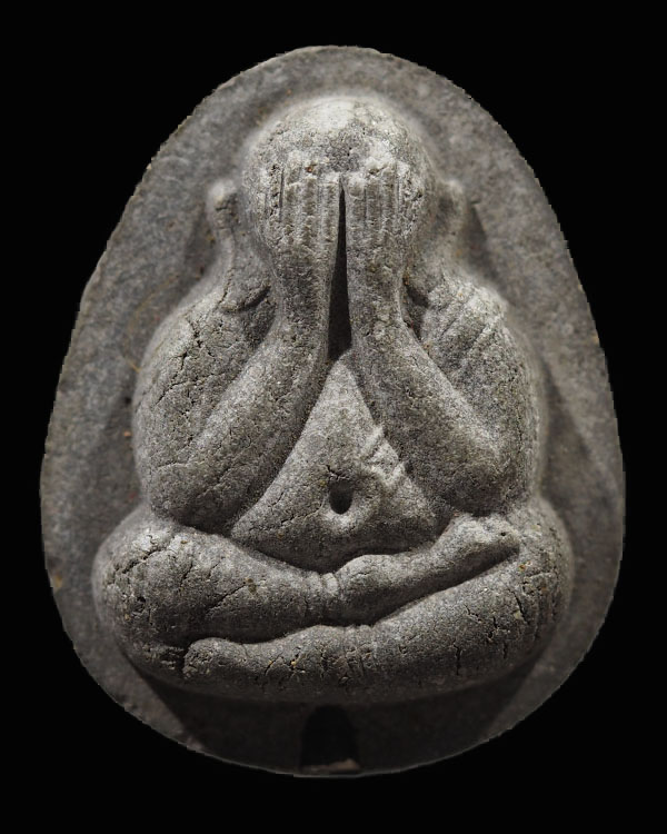 พระปิดตา เนื้อผง รุ่นยกช่อฟ้า หลวงพ่อเมี้ยน วัดโพธิ์กบเจา จ.อยุธยา ปี 2535 ด้านหลังมีเส้นเกศา และติด