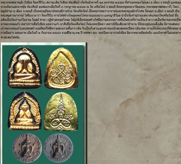 | **รหัส ศ.ร.๒๐๐๙๒ พระปิดตาจันทร์ลอย บัวบาน ท่านเจ้าคุณวิเชียร วัดเครือวัลย์ จ.ชลบุรี ยุคแรก หลังยันต์ ปี 2506 พระของท่านมีส่วนผสมผงเก่าพระปิดตาหลวงปู่แก้ว มีพุทธคุณด้านเมตตามหานิยม เป็นที่นิยมเล่นหากัน พระสภาพสวยสมบูรณ์ รูปแบบสวยงามเป็นเอกลักษณ์ พระเทพชลธารมุนี(วิเชียร จิตตวิริโย) ชาตะ21มกราคม2454 มรณภาพ2กันยายน2546 ท่านเป็นเจ้าคณะจังหวัด สมัยท่านยังมีชีวิตอยู่เป็นพระนักพัฒนา ชอบสร้างวัตถุมงคล เพื่อนำปัจจัยมาบูรณะวัดเครือวัลย์ จนเจริญรุ่งเรือง เป็นวัดที่อดีตและปัจจุบันยังไม่มีเมรุ วัตถุมงคลของท่านได้สร้างตั้งแต่ปี2500 เล็กน้อย จนกระทั่งท่านมรณภาพ ส่วนมากจะเป็น "พระปิดตาควัมบดี" ซึ่งสืบสานมาจากหลวงพ่อแก้ว ผู้เป็นหนึ่งในสุดยอดแห่งพระปิดตาแห่งเมืองสยามประเทศ เอกลักษณ์ของท่านจะลงรักสีดำ ปิดทองอย่างสวยงาม และบางรุ่นจะลงรักสีดำและปิดทองแผ่นเดียว |