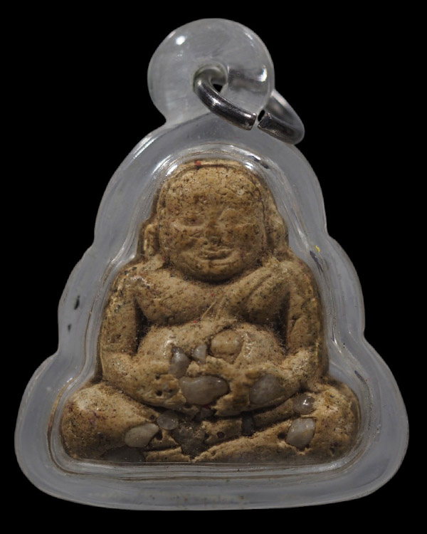 พระสังกัจจาย์เนื้อผง ด้านหน้าโรยเม็ดพระธาตุ ไว้เยอะมาก ด้านหลังปั๊ม "มั่ง มี ทรัพย์ " เลี่ยมเก่าๆ