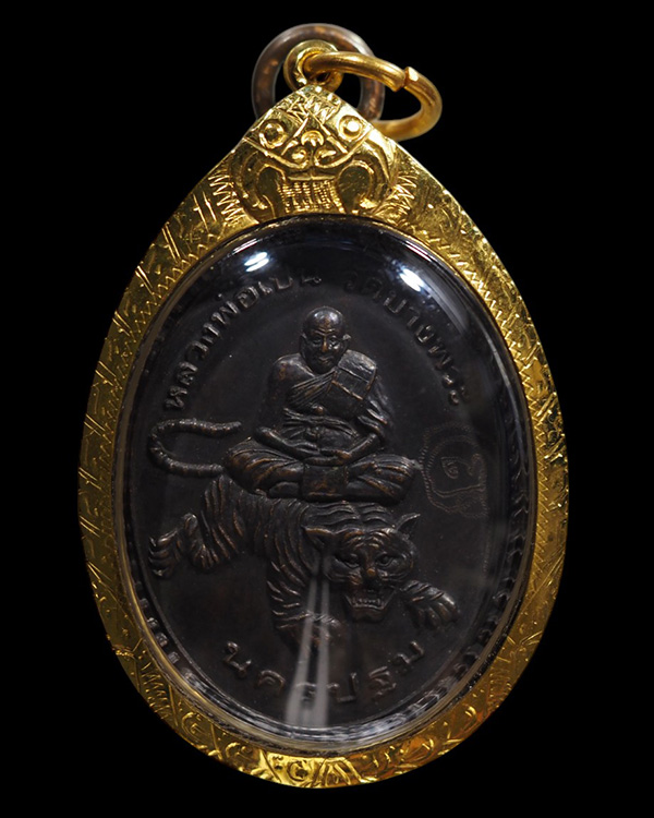 | **รหัส ศ.ร.๒๔๗๗๒ เหรียญนั่งเสือ มั่งมี ศรีสุข หลวงพ่อเปิ่น วัดบางพระ จ.นครปฐม ปี 2537 เนื้อทองแดงรมดำ เลี่ยมทองแท้ พร้อมใช้ สภาพสวย พิเศษมีจารด้านหน้าเหรียญ (ตอนเช่ามา ไม่มีห่วงทองติดมากับเหรียญ เลยต้องนำห่วงแสตนเลส มาใส่แทนไว้ให้ครับ แต่เฉพาะกรอบทองตอนนี้ถ้าทำใหม่น่าจะหลายพันแล้วครับ) |