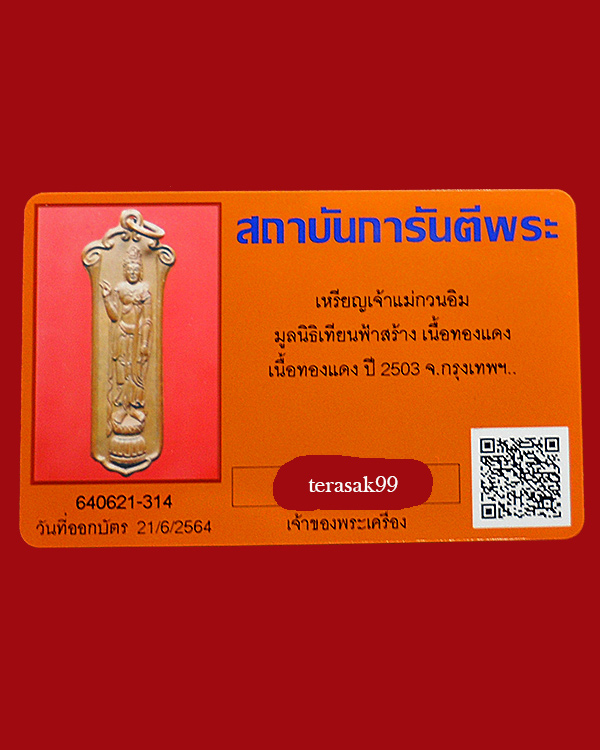 | ชื่อพระเครื่อง | เหรียญพระโพธิสัตว์(กวนอิม) มูลนิธิเทียนฟ้า ปี2503 พิมพ์นิยม+บัตรรับรอง สวยๆ |