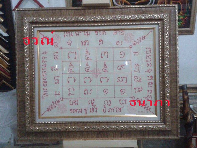| ผ้ายันต์จารมือ (เงินมาไม่ขาดสาย) หลวงปู่เฮง ปภาโส วัดบ้านด่านช่องจอม จ.สุรินทร์ สุดเขตประเทศไทย ติดชายแดนประเทศเขมร (กัมพูชา) พระเกจิขลัง จอมขมังเวทสายเขมร ศิษย์เอกหลวงพ่อคง วัดวังสรรพรส ผู้ใว้ใจให้เขียนอักขระยันต์ เขียนตะกรุด ตำรับฤิทธิ์ยันต์ตำรับฤิทธิ์ชัยมงคล ยอดมหายันต์เลื่องชื่อแห่งคงกะพันหนังเหนียว ตะกรุดถักมือเอง แคล้วคลาดมหาอุตม์ แต่เพียงผู้เดียว สร้างวัตถุมงคลขลัง ที่สุดในเมืองไทย สำหรับ เหรียญรุ่น 1 เจริญพร อายุ 84 ปี เหรียญหลวงปู่จารเอง หูตัน อึ้ง!โดยเฉพาะเนื้อทองคำแท้วิ่งหากันในมูลค่าพุ่งทะยานไกล สูงถึง 5 ล้านบาทเลยทีเดียว กำลังมาแรงมากตอนนี้ ของคลังสายเขมร ป้องกันตัว แคล้วคลาด ปลอดภัย มหาอุตม์ โชคลาภ การงานเจริญรุ่งเรือง เฮงสมชื่อ ฯลฯ ดีนักแลฯ (จารเมื่อ 11/09/2557) ขนาดของผ้ายันต์ 15x20 นิ้ว ไม่รวมกรอบ ประวัติพอสังเขป หลวงปู่เฮง ปภาโส พระเกจิชื่อดังสุรินทร์ “หลวงพ่อคง สุวัณโณ” หรือ พระครู อาคมวิสุทธิ์ อดีตเจ้าอาวาสวัด วังสรรพรส อ.ขลุง จ.จันทบุรี สมญานามว่า “เทพเจ้าแห่งเขาสมิง” เป็นพระเกจิอาจารย์ที่มีชื่อเสียงมากที่สุดรูปหนึ่งของภาคตะวันออก เป็นพระเกจิอาจารย์ร่วมสมัยกับ หลวงปู่ทิม อิสริโก วัดละหารไร่ จ.ระยอง สำหรับหลวงพ่อคงได้รับนิมนต์ไปร่วมพิธีพุทธาภิเษกในพิธีใหญ่ พร้อมกับพระเกจิอาจารย์ร่วมสมัยอยู่หลายครั้ง เมื่อคราวปลุกเสกพระเครื่องฉลอง 25 ศตวรรษ ที่ท้องสนามหลวง พ.ศ.2500 ก็ได้ร่วมในพิธีครั้งนั้นด้วย ปัจจุบันมีศิษย์สืบทอดพุทธาคมของท่านอีกรูปหนึ่ง คือ “หลวงปู่เฮง ปภาโส” เจ้าอาวาสวัดบ้านด่านช่องจอม (วัดพัฒนาธรรมาราม) บ้านด่านช่องจอม อ.กาบเชิง จ.สุรินทร์ สิริอายุ 91 ปี เกิดเมื่อปีเถาะ เดือนสิงหาคม 2470 พ่อแม่เป็นชาวกัมพูชา แต่อพยพมาอยู่ประเทศไทยในสมัยที่ฝรั่งเศสปกครอง โดยย้ายมาอยู่หมู่บ้านปราสาท ต.ตาอ็อง อ.เมือง จ.สุรินทร์ ประกอบอาชีพทำนาทำสวน มีพี่น้องด้วยกัน 13 คน เป็นบุตรคนที่ 7 ที่หมู่บ้านปราสาท ในวัยเด็กอายุประมาณ 13-14 ปี พระอาจารย์เฉิด ธัมมกโร ลูกพี่ลูกน้องของหลวงปู่เฮง เดินทางธุดงค์มาจากประเทศกัมพูชา เข้ามาเยี่ยมญาติ พี่น้องที่ประเทศไทย บอกจะเดินธุดงค์ไปเรื่อยๆ ก่อนที่จะไปได้บอกกับแม่ของท่าน ว่า “โยมอาฉันอยากจะขอให้น้องไปด้วยโยมอาจะว่าอย่างไร ฉันจะได้สอนให้น้องได้หัด เรียนเขียนอ่านจะได้รู้หนังสือ” ทำให้ได้ศึกษาอักษรขอมศาสตร์วิชาแขนงต่างๆ ตั้งแต่บัดนั้น ศึกษากับพระอาจารย์เฉิด พระพี่ชายตั้งแต่อายุ 14 ปี เรียนภาษาขอม และภาษาบาลี และออกธุดงค์ไปด้วยเสมอ ครั้นอายุ 21 ปี ไปเป็นทหารที่ก