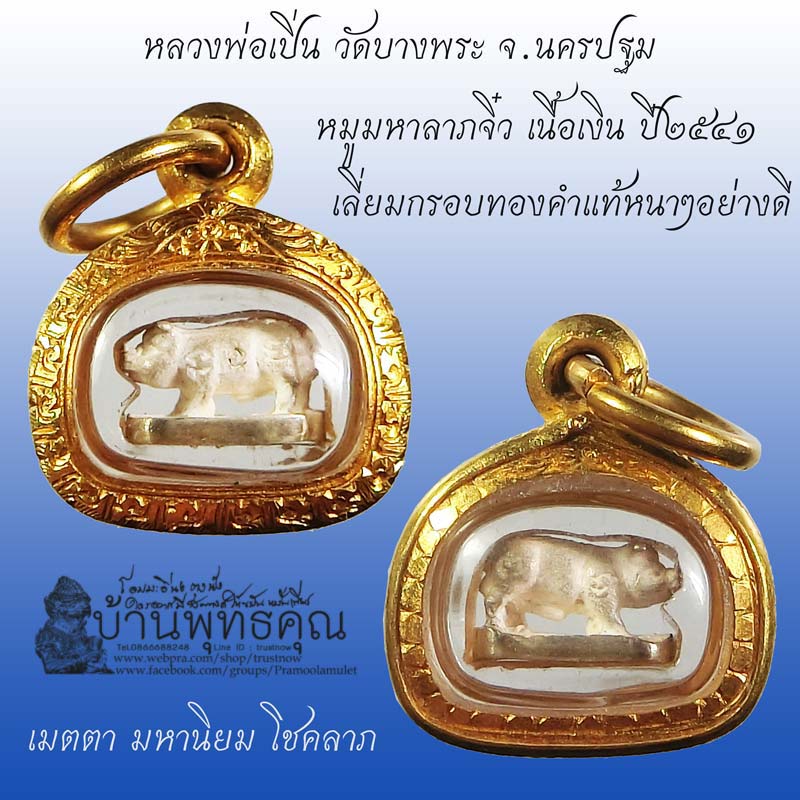 | ชื่อพระเครื่อง | เลี่ยมทองสวยๆพร้อมบูชา หมูมหาลาภจิ๋ว เนื้อเงิน หลวงพ่อเปิ่น วัดบางพระ จ.นครปฐม ปี 2541 |