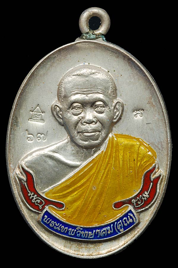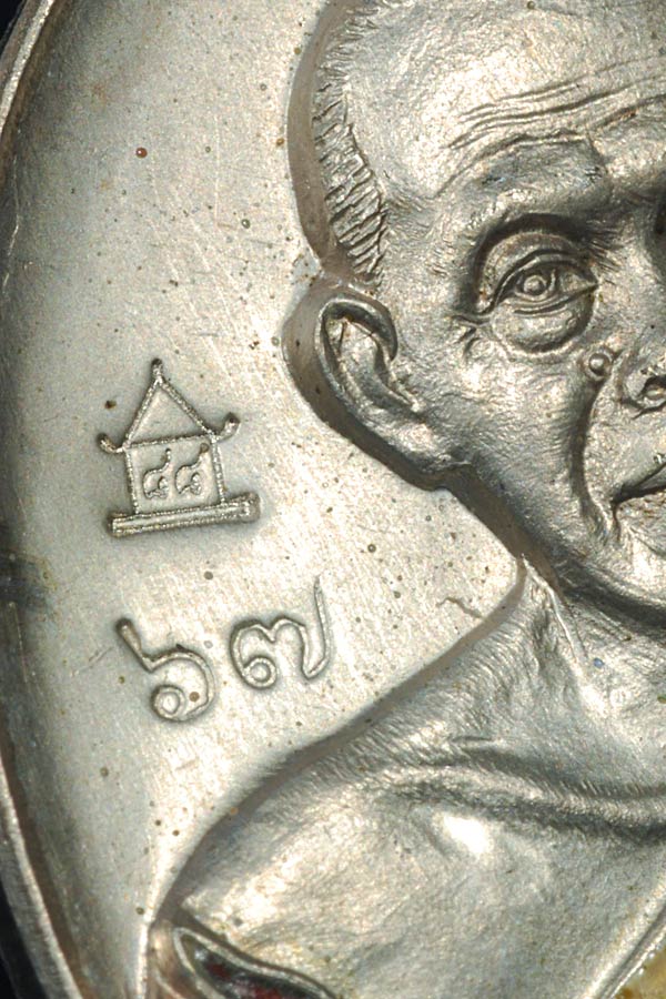 | เหรียญห่วงเชื่อม รุ่นแรก ออกวัดปรก ๕๓ เนื้อเงินลงยา No.๖๗ (เลขสองหลักเรียง) สภาพสวยผิวเดิม จำนวนการจัดสร้าง ๑,๑๘๘ เหรียญ เหรียญนี้มีพิเศษที่มีตอกโค๊ตศาลาหนึ่งตัว (ยังไม่เจอเหรียญสอง) จมูกมีตำหนิตามรูปนิดหน่อยแต่แทนได้ที่เลขสองหลักเรียงกับโค๊ตศาลา พิเศษแบบนี้มีดีต้องโชว์ครับ |